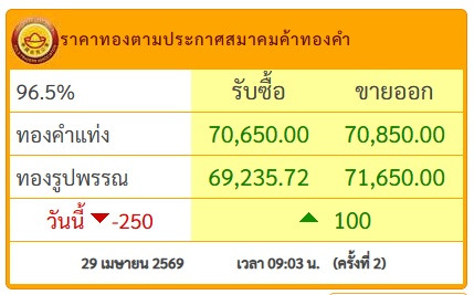 วันที่ 29 เม.ย.69 สมาคมค้าทองคำประกาศราคาทอง วันนี้ (27 เม.ย.2569) ประกาศครั้งที่ 2 เมื่อเวลา 09.03 น.ปรับขึ้น 100 บาท โดยมีรายละเอียดดังนี้