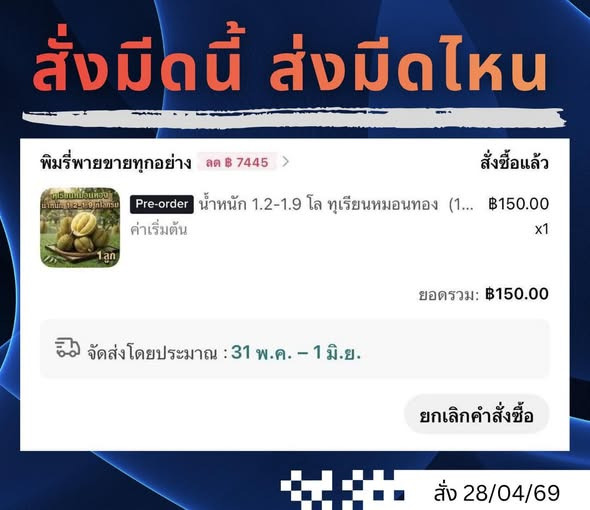 นี่เป็นคำสั่งซื้อทุเรียนคุณพิมรี่พาย 28 เม.ย. (ออเดอร์นี้ไม่ใช่ลูกละ 100) จะเห็นได้ว่าจัดส่งได้ 31 พ.ค. ก็ค่อนข้างตกใจว่านานไปหรือไม่ หรืออาจเป็นการต้้งเวลา preorder เผื่อไว้เฉยๆ อาจจะได้รับเร็ว