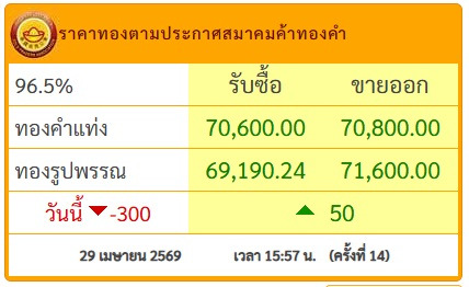 วันที่ 29 เม.ย.69 สมาคมค้าทองคำประกาศราคาทอง วันนี้ (29 เม.ย.2569) ประกาศครั้งที่ 14 เมื่อเวลา 15.57 น.ปรับขึ้น 50 บาท โดยมีรายละเอียดดังนี้