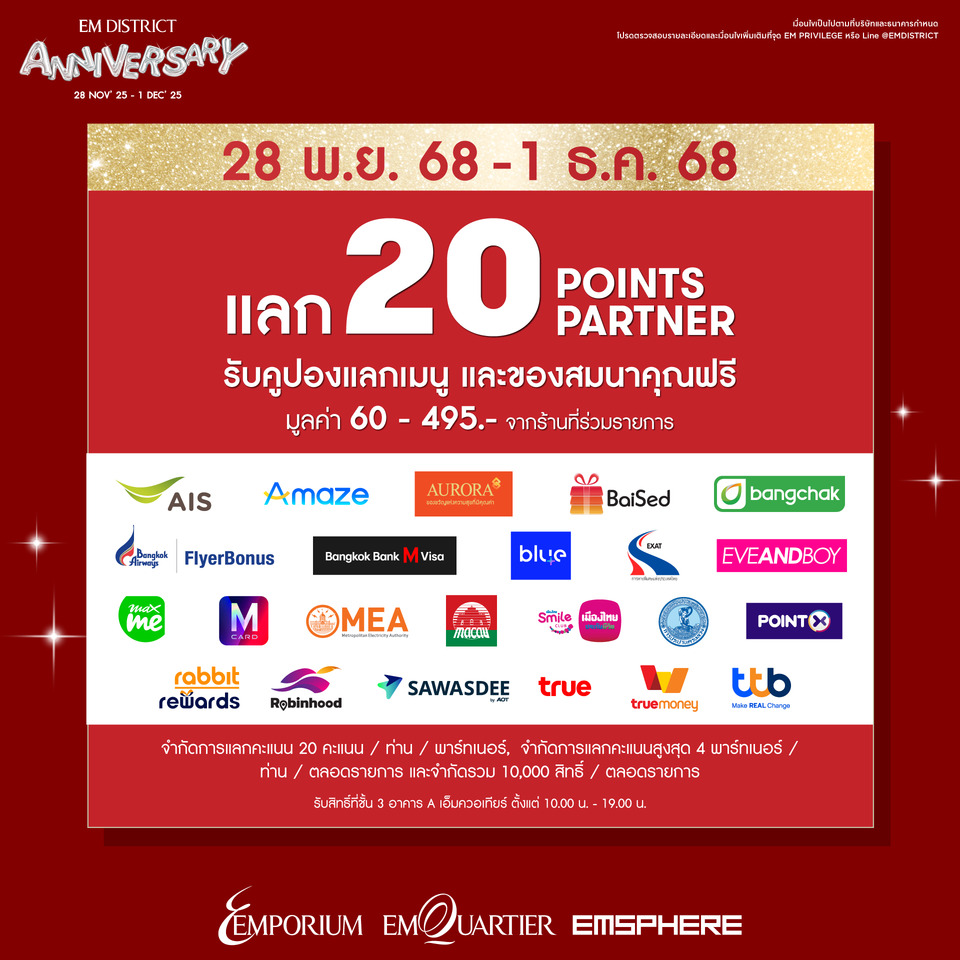 นางสุธาวดี ศิริธนชัย กรรมการผู้จัดการสายงานการตลาด เอ็ม ดิสทริค กล่าวถึงความพิเศษของแคมเปญฉลองครบรอบ 2 ปี เอ็ม ดิสทริคว่า ในช่วงเวลาสุดพิเศษนี้ เอ็ม ดิสทริค จับมือกับพันธมิตรมากมาย ได้แก่ M Card, บัตรเครดิตธนาคารกรุงเทพ, บัตรเครดิต Bangkok Bank M Visa, บัตรเครดิต อิออน, บัตรเครดิต CardX และ SCB, บัตรเครดิตกสิกรไทย, บัตรเครดิต กรุงศรี, บัตรเครดิต ttb บัตรเครดิตยูโอบี, สายการบิน Starlux Airlines, Excellent Vacation Group, HoverAir, OSIM การท่องเที่ยวมาเก๊าประจำประเทศไทย, การทางพิเศษแห่งประเทศไทย, การประปานครหลวง การไฟฟ้านครหลวง, บางจาก, เมืองไทยประกันชีวิต, AIS, Amaze, AURORA, Baised Application Bangkok Airways, blueplus+, EVEANDBOY, Maxme, Point X, Rabbit Rewards, Robinhood, Sawasdee by AOT, TRUE, True Money ร่วมจัดแคมเปญยิ่งใหญ่ EM DISTRICT ANNIVERSARY UNSTOPPABLE HAPPINESS UNMISSABLE REWARDS มอบความพิเศษฉลองโอกาสครบรอบ 2 ปี พร้อมหลากหลายสิทธิพิเศษสุดเอ็กซ์คลูซีฟตลอด 4 วันเต็ม ระหว่างวันที่ 28 พฤศจิกายน 2568 – 1 ธันวาคม 2568 โดยการนำคะแนนจากพันธมิตรธุรกิจกว่า 23 พันธมิตรที่ร่วมแคมเปญ 20 คะแนน แลกรับของสมนาคุณ หรือเมนูฟรีจากร้านอาหารชั้นนำในศูนย์การค้ามากมาย