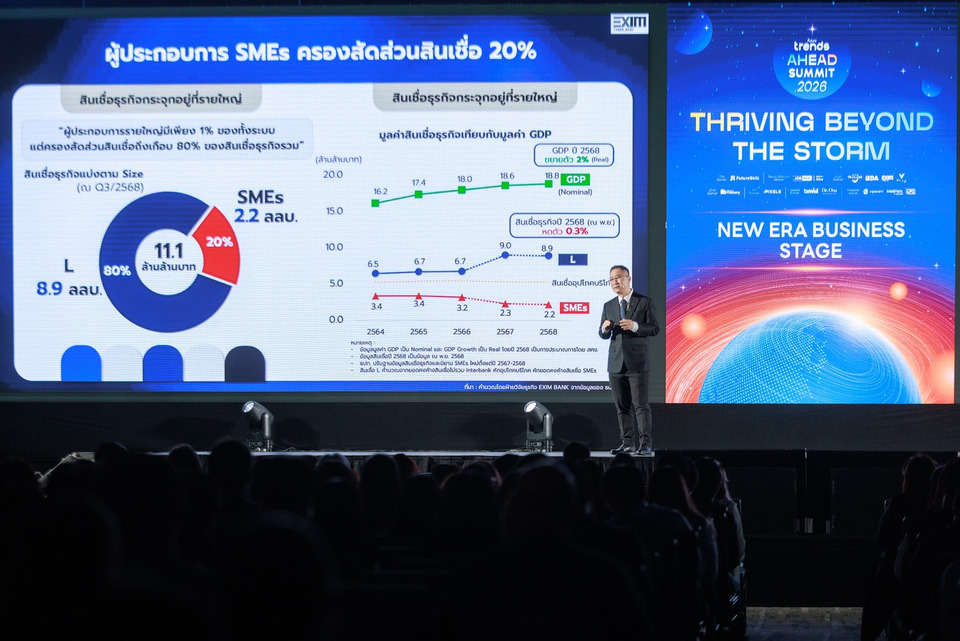 วันที่ 10 กุมภาพันธ์ 2569 นายชลัช รัตนบุญนิธิ กรรมการผู้จัดการ ธนาคารเพื่อการส่งออกและนำเข้าแห่งประเทศไทย (EXIM BANK) ร่วมเป็นวิทยากรบรรยายในงานสัมมนา Future Trends Ahead Summit 2026 หัวข้อ “Beyond the Storm, Beyond Borders: ปลดล็อกศักยภาพ SMEs ไทยสู่เวทีการค้าโลก” จัดโดยบริษัท ไลค์ มี จำกัด ผู้ผลิตสื่อและเอเจนซีเจ้าของแบรนด์ Future Trends aomMONEY และ FutureSkill ณ ศูนย์การค้าสยามพารากอน