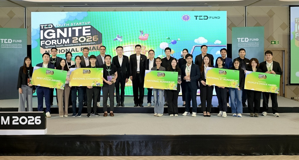 วันที่ 7 เม.ย.69 กองทุนพัฒนาผู้ประกอบการเทคโนโลยีและนวัตกรรม (TED Fund) ภายใต้กระทรวงการอุดมศึกษา วิทยาศาสตร์ วิจัยและนวัตกรรม (อว.) เดินหน้าสร้างระบบนิเวศสตาร์ทอัพไทยอย่างต่อเนื่อง จัดงาน “TED Youth Startup – IGNITE Forum 2026 : National Final” รอบชิงชนะเลิศระดับประเทศ เวทีใหญ่แห่งปี เฟ้นหาสุดยอดนวัตกรรมจากเยาวชนและผู้ประกอบการรุ่นใหม่ทั่วประเทศ เพื่อเปิดพื้นที่ให้สตาร์ทอัพรุ่นใหม่ได้แสดงศักยภาพ นำเสนอผลงานนวัตกรรมที่พร้อมต่อยอดสู่ธุรกิจจริง โดยมี ศ.ดร.ศุภชัย ปทุมนากุล ปลัดกระทรวง อว. เป็นประธานในพิธีมอบรางวัล พร้อมด้วย น.สพ.ดร. สนัด วงศ์ทวีทอง ผู้จัดการกองทุนฯ และคณะกรรมการผู้ทรงคุณวุฒิ เข้าร่วมแสดงความยินดี ณ ศูนย์การประชุมแห่งชาติสิริกิติ์ กรุงเทพมหานคร