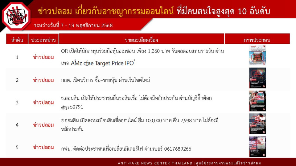 ทั้งนี้ในระหว่างวันที่ 7 – 13 พฤศจิกายน 2568 พบข้อความที่เข้ามาทั้งหมด 998,165 ข้อความข้อความ โดยมีข้อความที่ต้องดำเนินการตรวจสอบ (Verify) ทั้งสิ้น 1,186 ข้อความ สำหรับช่องทางที่มีการพบเบาะแสมากที่สุด คือ ข้อความที่มาจาก Social Listening จำนวน 1,157 ข้อความ ตามมาด้วยการแจ้งเบาะแสผ่าน Line Official จำนวน 26 ข้อความ และช่องทาง Facebook จำนวน 3 ข้อความ รวมเรื่องที่ต้องดำเนินการตรวจสอบทั้งหมด 249 เรื่อง และจากการประสานงานกับหน่วยงานที่เกี่ยวข้อง ได้รับผลการตรวจสอบกลับมาแล้ว 97 เรื่อง โดยในจำนวนนี้เป็นข่าวปลอมเกี่ยวกับอาชญากรรมออนไลน์ที่ได้รับความสนใจจากประชาชนมากที่สุด 10 อันดับ ได้แก่