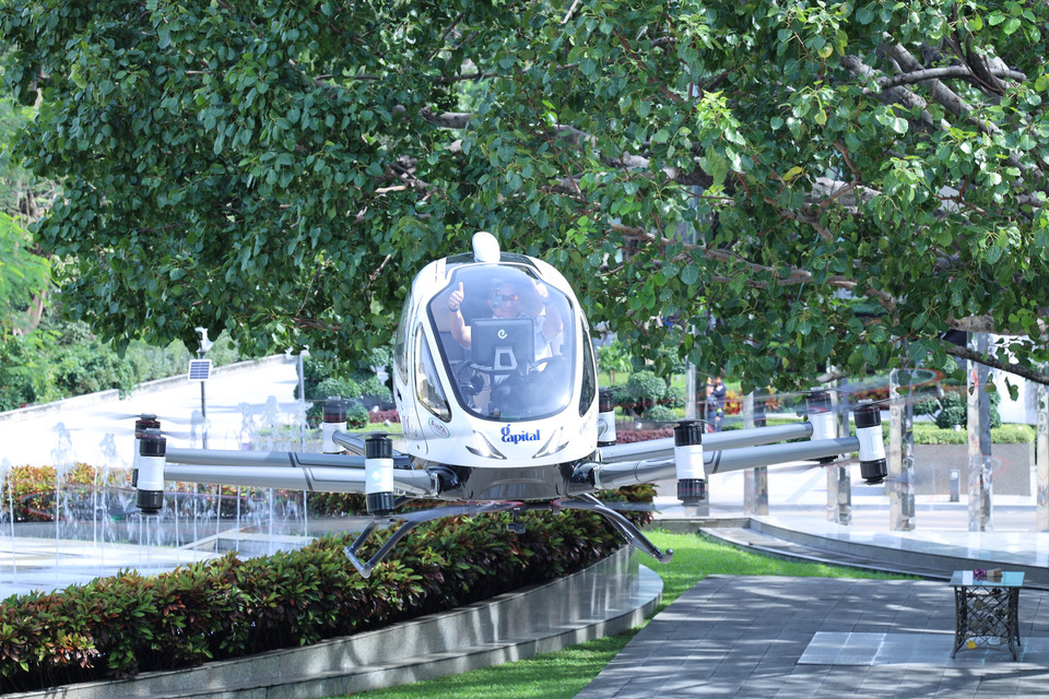 อากาศยาน eVTOL รุ่นที่นำมาสาธิตเป็นอากาศยานไร้คนขับแบบผู้โดยสาร (Passenger-grade UAV) จากบริษัท eHang โดยมีคุณสมบัติคือความเร็วสูงสุด (Maximum Design Speed) 130 กิโลเมตรต่อชั่วโมง ระยะปฏิบัติการบิน 30 กิโลเมตร และสามารถบรรทุกผู้โดยสารได้ 2 ที่นั่ง ถือเป็นอีกหนึ่งต้นแบบสำคัญของเทคโนโลยี Advanced Air Mobility (AAM) ที่จะเข้ามาเปลี่ยนโฉมระบบขนส่งทางอากาศในอนาคต