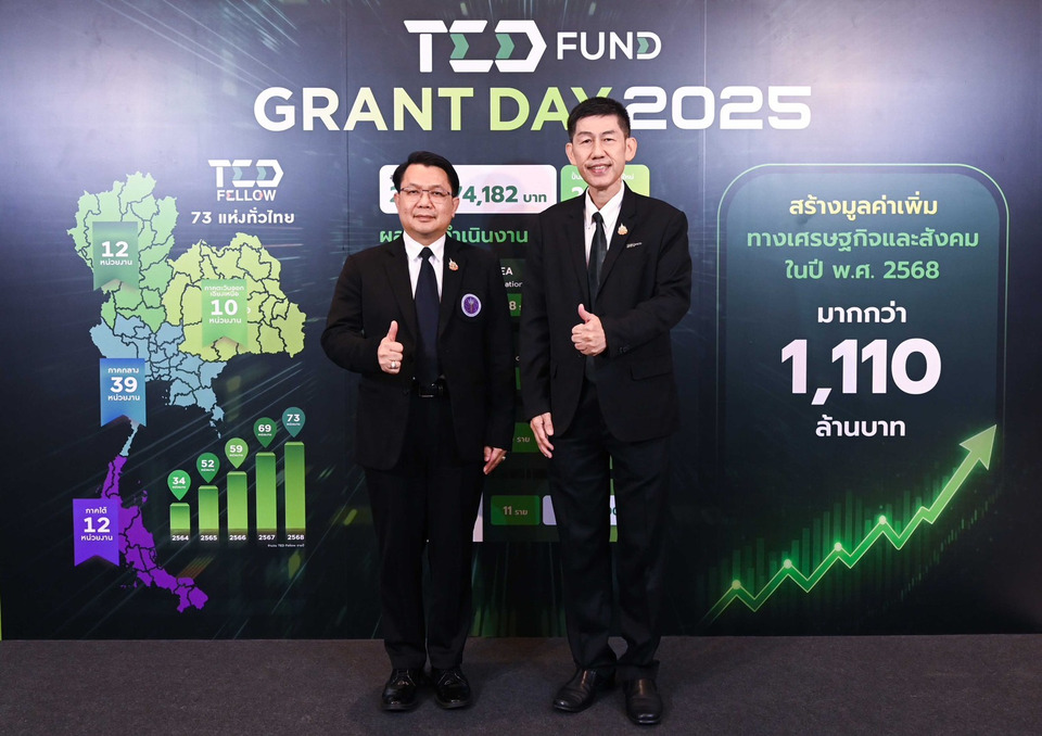 “โดยตลอดระยะเวลา 9 ปี ในการดำเนินงาน TED Fund ก็ได้ทำหน้าที่สนับสนุนผู้ประกอบการด้านเทคโนโลยี และนวัตกรรมเป็นจำนวนกว่า 1,400 โครงการ มูลค่าทุนสนับสนุนกว่า 1,300 ล้านบาท และในปี 2568 สามารถสร้างผลกระทบเชิงเศรษฐกิจและสังคม รวมมูลค่ากว่า 1,110 ล้านบาท ดังนั้นผู้ที่ได้รับทุนในปีนี้ ถือว่าเป็นกำลังสำคัญรุ่นใหม่ ที่จะเข้ามาพัฒนา ช่วยผลักดันประเทศไทย ให้กลายเป็นประเทศแห่งศูนย์กลางของเทคโนโลยี และนวัตกรรมสมัยใหม่ เพื่อขับเคลื่อนอนาคตของเศรษฐกิจไทยให้เติบโตอย่างมั่นคง และยั่งยืนต่อไป” น.สพ.ดร.สนัด กล่าวเพิ่มเติม