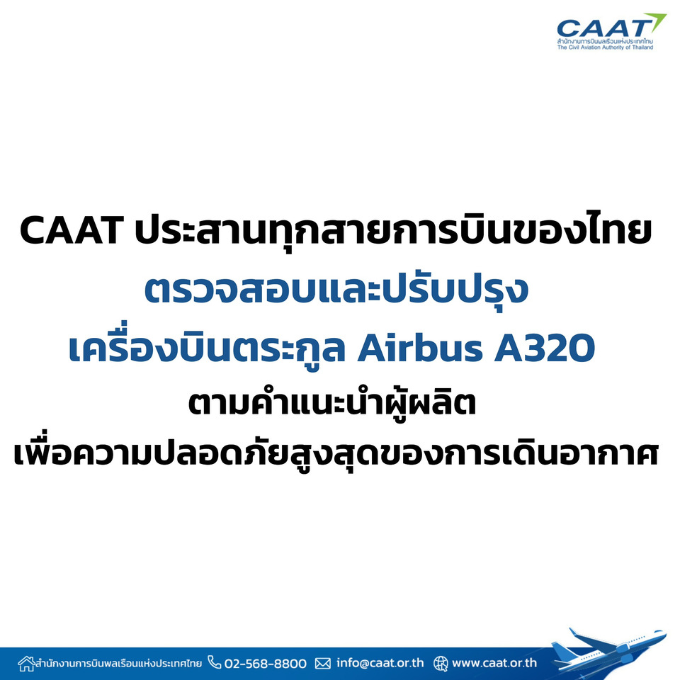 CAAT ยืนยันว่าการปฏิบัติการบินในฝูงบิน Airbus A320 ของไทยยังคงสามารถดำเนินการได้ตามปกติอย่างปลอดภัย พร้อมเฝ้าติดตามการดำเนินการของสายการบินทุกแห่งอย่างใกล้ชิด เพื่อให้มั่นใจว่าการแก้ไขเป็นไปอย่างครบถ้วน ทันท่วงที และไม่ส่งผลกระทบต่อผู้โดยสาร