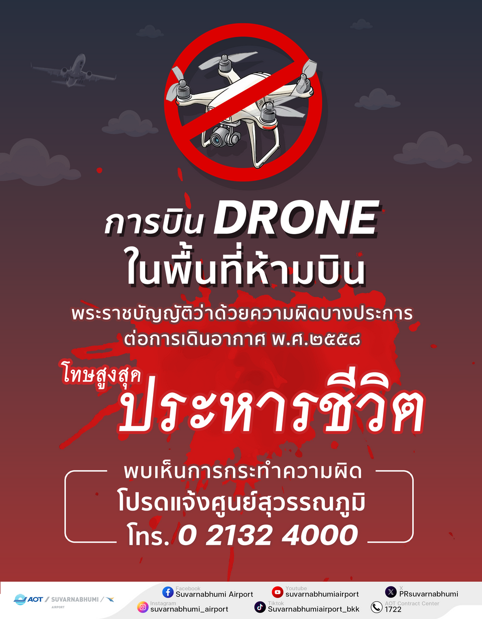 นายกิตติพงศ์ กล่าวว่า การบินอากาศยานไร้คนขับใกล้เขตสนามบินเป็นการกระทำที่ผิดกฎหมายและมีความเสี่ยงสูง โดยเฉพาะในรัศมี 9 กิโลเมตร ผู้ฝ่าฝืนมีโทษตามกฎหมาย โดยหากเข้าข่ายความผิดเกี่ยวกับ พ.ร.บ. ว่าด้วยความผิดบางประการต่อการเดินอากาศ พ.ศ.2558 ผู้ฝ่าฝืนมีโทษหนักถึงขั้นประหารชีวิต พร้อมขอความร่วมมือประชาชน หากพบเห็นสิ่งผิดปกติสามารถแจ้ง ศูนย์สุวรรณภูมิ โทร. 0 2132 4000 ได้ตลอด 24 ชั่วโมง ทสภ. ยืนยันให้ความสำคัญสูงสุดกับความปลอดภัย และมีความพร้อมอย่างเต็มที่ในการดูแลผู้โดยสารและการเดินอากาศ เพื่อสร้างความเชื่อมั่นแก่ประชาชน ผู้ใช้บริการ และสนับสนุนภาพลักษณ์การท่องเที่ยวของประเทศไทยอย่างยั่งยืน