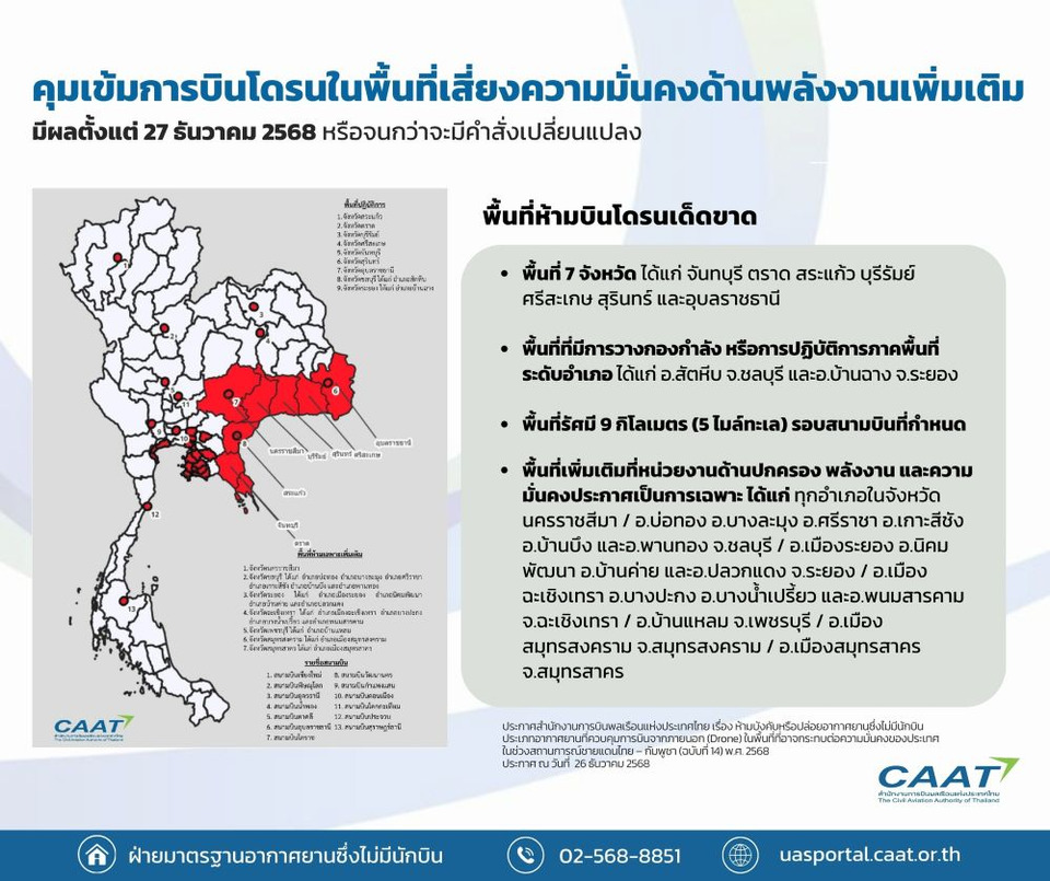 วันที่ 26 ธํนวาคม 2568 สำนักงานการบินพลเรือนแห่งประเทศไทย (CAAT) ออกประกาศสำนักงานการบินพลเรือนแห่งประเทศไทย เรื่อง ห้ามบังคับหรือปล่อยอากาศยานซึ่งไม่มีนักบิน (โดรน) ในพื้นที่ที่อาจกระทบต่อความมั่นคงของประเทศในช่วงสถานการณ์ชายแดนไทย–กัมพูชา (ฉบับที่ 14) พ.ศ. 2568 มีผลบังคับใช้ตั้งแต่วันที่ 27 ธันวาคม 2568 เป็นต้นไป จนกว่าจะมีประกาศเปลี่ยนแปลง