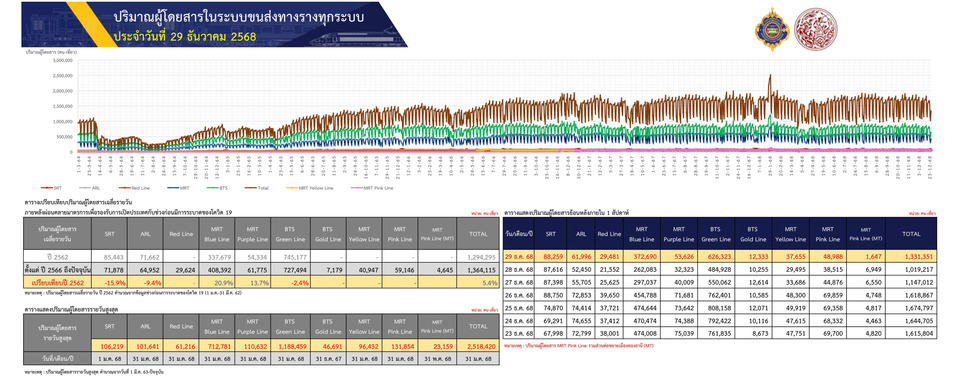 • ระบบรถไฟฟ้า มีผู้ใช้บริการรวม 1,243,092 คน-เที่ยว (ต่ำกว่าประมาณการร้อยละ 14.50) โดยสายที่มีผู้ใช้บริการสูงกว่าประมาณการ ได้แก่ สายสีทอง เนื่องจากมีการจัดงาน Amazing Thailand Countdown 2026 ณ ไอคอนสยาม และ สายสีชมพู ส่วน Airport Rail Link (ARL) สูงกว่าประมาณการเล็กน้อย รายละเอียดผู้ใช้บริการดังนี้
