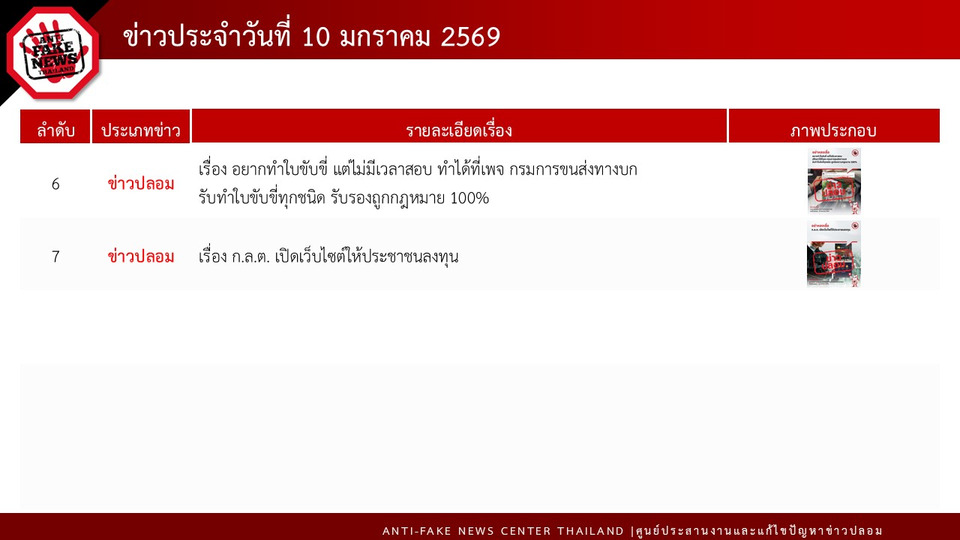 อันดับที่ 6 ข่าวปลอม เรื่อง อยากทำใบขับขี่ แต่ไม่มีเวลาสอบ ทำได้ที่เพจ กรมการขนส่งทางบก รับทำใบขับขี่ทุกชนิด รับรองถูกกฎหมาย 100%