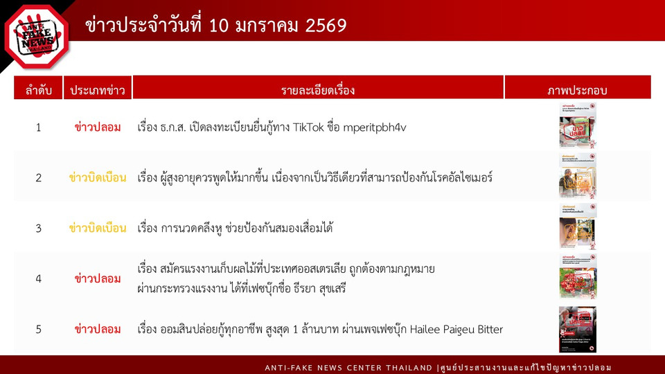 ทั้งนี้ ในวันที่ 10 มกราคม 2569 AFNC ได้ตรวจสอบพบข้อความทั้งหมด 156,428 ข้อความ โดยมีข้อความที่ต้องดำเนินการตรวจสอบ (Verify) ทั้งสิ้น 5,294 ข้อความ สำหรับช่องทางที่มีการพบเบาะแสมากที่สุด คือ ข้อความที่มาจาก Social Listening 5,289 ข้อความ ตามมาด้วยช่องทาง Facebook 5 ข้อความ โดยเป็นเรื่องที่ต้องดำเนินการตรวจสอบทั้งหมด 42 เรื่อง ได้รับผลการตรวจสอบจากหน่วยงานที่เกี่ยวข้องแล้ว 9 เรื่องในจำนวนนี้เป็นข่าวที่ได้รับความสนใจจากประชาชนมากที่สุด 7 เรื่อง ซึ่งเป็น ข่าวปลอม 5 เรื่อง และข่าวบิดเบือน 2 เรื่อง ได้แก่