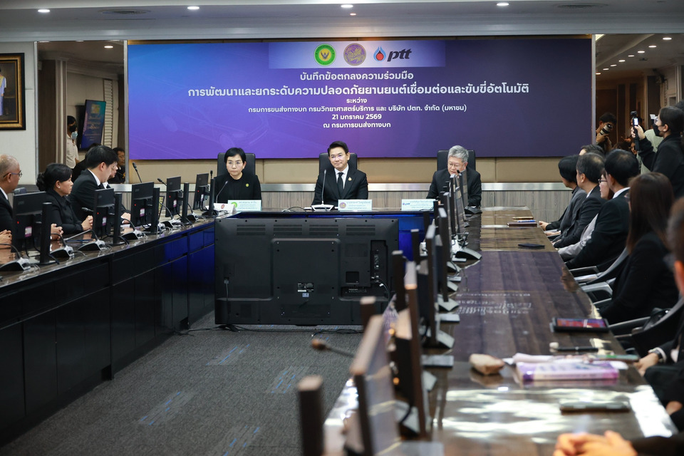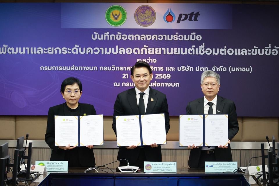 วันที่ 21 มกราคม 2569 กรมการขนส่งทางบก นายสรพงศ์ ไพฑูรย์พงษ์ อธิบดีกรมการขนส่งทางบก นางพจมาน ท่าจีน รองอธิบดี รักษาราชการแทน อธิบดีกรมวิทยาศาสตร์บริการ และนายรัตติกูล ปิยะวงค์วาณิชย์รองกรรมการผู้จัดการใหญ่วิศวกรรมโครงการและการปฏิบัติการสู่ความเป็นเลิศ บริษัท ปตท. จำกัด (มหาชน) ลงนามข้อตกลงความร่วมมือพัฒนาและยกระดับความปลอดภัยยานยนต์เชื่อมต่อและขับขี่อัตโนมัติ (Connected and Autonomous Vehicle: CAV) โดยเป็นการบูรณาการความร่วมมือระหว่าง 3 หน่วยงาน ได้แก่ กรมการขนส่งทางบก กรมวิทยาศาสตร์บริการ และบริษัท ปตท. จำกัด (มหาชน)โดยมีวัตถุประสงค์เพื่อร่วมกันขับเคลื่อนการพัฒนาและยกระดับความปลอดภัยในการใช้งาน CAV อย่างครบวงจร ตั้งแต่การศึกษาวิจัย การพัฒนา การทดสอบ และการอนุญาตใช้งาน ไปจนถึงการสร้างความเชื่อมั่นแก่ประชาชน โดยมุ่งสนับสนุนการจัดทำมาตรฐาน ข้อกำหนด และกฎหมายที่เกี่ยวข้องให้สอดคล้องกับมาตรฐานสากล ควบคู่กับการพัฒนาและเสริมสร้างศักยภาพบุคลากร เพื่อรองรับการนำเทคโนโลยียานยนต์สมัยใหม่มาใช้อย่างปลอดภัย และเหมาะสมกับบริบทของประเทศไทย