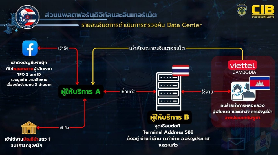 นายไตรรัตน์ กล่าวว่า สำนักงานกสทช.ได้รับการประสานจาก บก.ปอท. เมื่อวันที่ 20 ม.ค. 2569 ขอให้ลงพื้นที่ร่วมกันตรวจสอบจุดเชื่อมต่อโครงข่ายอินเทอร์เน็ต (โหนด) ในพื้นที่ ต.ท่าข้าม อ.อรัญประเทศ จ.สระแก้ว ในวันที่ 21 ม.ค. 2569 เป็นการเร่งด่วน โดย บก.ปอท. ได้ขอหมายค้นพื้นที่ที่มีการตั้งจุดเชื่อมต่อโครงข่ายอินเทอร์เน็ตดังกล่าว หลังจากที่สืบทราบว่า IP Address ดังกล่าวถูกนำไปใช้งานในประเทศกัมพูชา ซึ่งไม่ถูกต้องตามมาตรการป้องกันและปราบปรามอาญชากรรมทางเทคโนโลยี ที่ห้ามมิให้นำ IP Address ซึ่งจดทะเบียนในประเทศไทยไปให้บริการในต่างประเทศ โดยกรณีนี้ธนาคารได้สังเกตความผิดปกติของการใช้งาน IP Address ดังกล่าว จึงได้แจ้งประสานตรวจสอบพบความผิดปกติกับ บก.ปอท. ก่อนที่ บก.ปอท. จะขอความร่วมมือมายังสำนักงาน กสทช. เพื่อให้ร่วมลงพื้นที่ตรวจสอบ