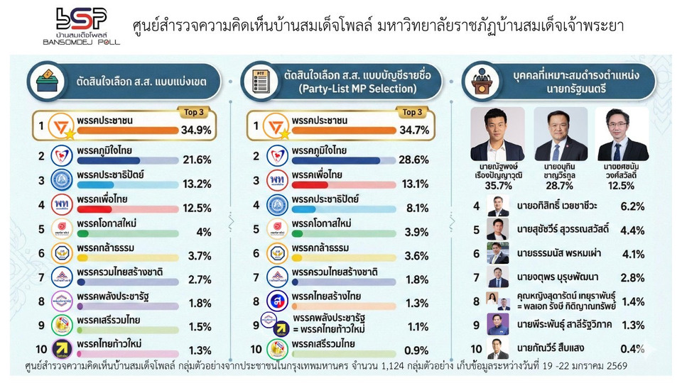 ศูนย์สำรวจความคิดเห็นบ้านสมเด็จโพลล์ มหาวิทยาลัยราชภัฏบ้านสมเด็จเจ้าพระยา ได้ดำเนินโครงการสำรวจความคิดเห็นเกี่ยวกับการเลือกตั้งสมาชิกสภาผู้แทนราษฏร (ก่อนการเลือกตั้ง 15 วัน) โดยเก็บจากกลุ่มตัวอย่างจากประชาชนที่อาศัยอยู่ในจังหวัดกรุงเทพมหานคร โดยมีการกระจายการเก็บข้อมูลในกลุ่มเขตชั้นใน กลุ่มเขตชั้นกลาง กลุ่มเขตชั้นนอก จำนวนทั้งสิ้น 1,124 กลุ่มตัวอย่าง เก็บข้อมูลระหว่างวันที่ 19 - 22 มกราคม 2569