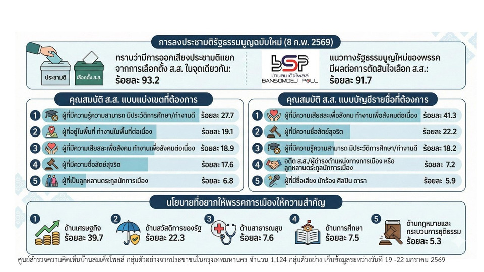 ทราบว่าในวันที่ 8 กุมภาพันธ์ 2569 มีการออกเสียงประชามติ ในประเด็นคำถาม ท่านเห็นชอบว่าสมควรมีรัฐธรรมนูญฉบับใหม่หรือไม่ โดยไปลงคะแนนเสียงแยกจากการเลือกตั้งสมาชิกสภาผู้แทนราษฏรที่อยู่ในจุดเลือกตั้งเดียวกัน ร้อยละ 93.2 และคิดว่าการมีแนวทางในการมีรัฐธรรมนูญฉบับใหม่ของพรรคการเมือง มีผลต่อการตัดสินใจในการเลือกสมาชิกสภาผู้แทนราษฏร ร้อยละ 91.7