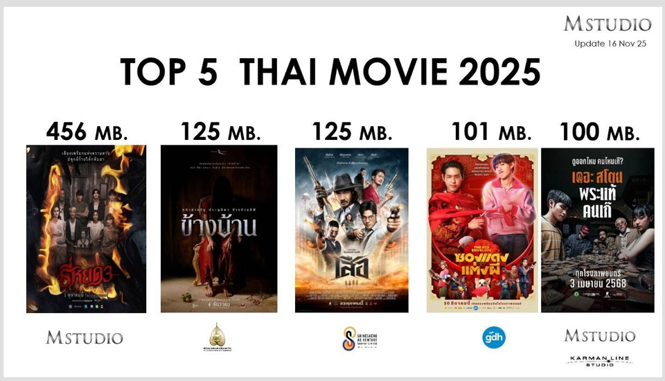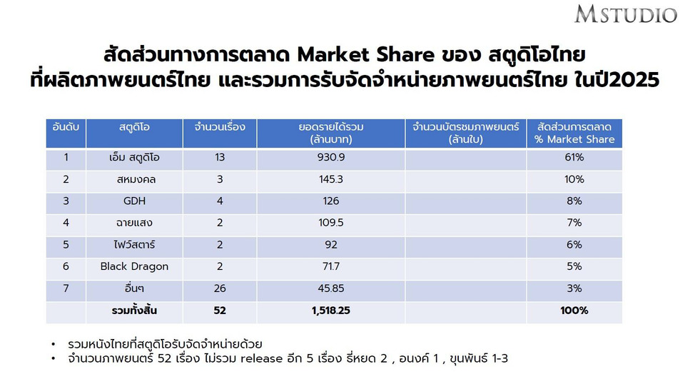 ในปี 2568 อุตสาหกรรมภาพยนตร์ไทยมีมูลค่ารวมประมาณ 1,518.25 ล้านบาท โดยรายได้ของ M STUDIO ที่รวมหนังไทยที่สตูดิโอรับจัดจําหน่ายรวมประมาณ 930.9 ล้านบาท ซึ่งครองสัดส่วนรายได้เป็น 61% ของตลาดรวม สะท้อนความเชื่อมั่นของผู้ชมที่มีต่อคอนเทนต์ไทยอย่างมีนัยสำคัญ ตอกย้ำสถานะผู้นำตลาดผ่านผลงานเชิงตัวเลข โดยก้าวขึ้นเป็น สตูดิโอผู้ผลิตและจัดจำหน่ายภาพยนตร์ไทยอันดับ 1 ติดต่อกัน 3 ปีซ้อน มีภาพยนตร์หลายเรื่องทำรายได้ตั้งแต่ 100 ล้านบาท ไปจนถึงมากกว่า 800 ล้านบาท จากหลายโปรเจกต์สำคัญ อย่างไรก็ตาม M STUDIO มองว่า ความสำเร็จในอดีตไม่เพียงพอสำหรับการแข่งขันในระยะยาว “วันนี้หนังไทยไม่ได้แข่งกันแค่จำนวนเรื่อง แต่แข่งกันที่ ‘คุณค่าของคอนเทนต์’ และความสามารถในการต่อยอดในระยะยาว”