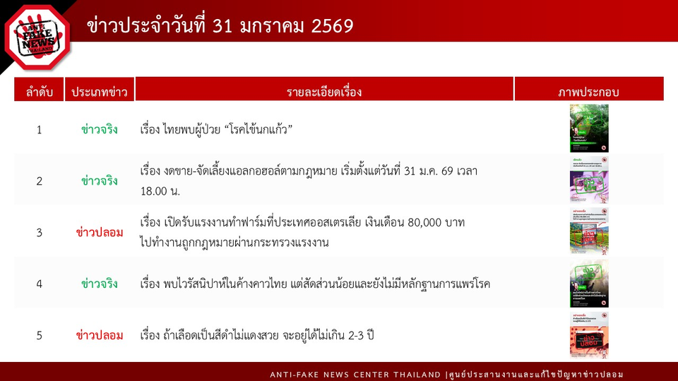 สำหรับอันดับ 1 เป็นข่าวจริง : เรื่อง “ไทยพบผู้ป่วย “โรคไข้นกแก้ว”” กระทรวงดีอี ได้ประสานงานร่วมกับ กรมควบคุมโรค กระทรวงสาธารณสุข ยืนยันเป็น “ข่าวจริง” ปัจจุบัน ประเทศไทยพบผู้ป่วยโรคไข้นกแก้ว (Psittacosis) จำนวน 1 ราย เมื่อปลายปี 2568 มีโรคประจำตัวและมีประวัติเลี้ยงนกในพื้นที่อากาศไม่ถ่ายเท โดยไม่ได้ใช้อุปกรณ์ป้องกันขณะทำความสะอาดกรง ปัจจุบันได้รับการรักษาจนหายดีแล้ว