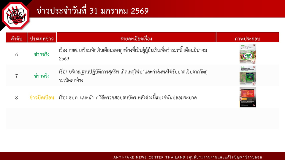 ทั้งนี้ ในวันที่ 31 มกราคม 2569 AFNC ได้ตรวจสอบพบข้อความทั้งหมด 159,177 ข้อความ โดยมีข้อความที่ต้องดำเนินการตรวจสอบ (Verify) ทั้งสิ้น 7,734 ข้อความ สำหรับช่องทางที่มีการพบเบาะแสมากที่สุด คือ ข้อความที่มาจาก Social Listening 7,733 ข้อความ ตามมาด้วยช่องทาง Line 1 ข้อความ โดยเป็นเรื่องที่ต้องดำเนินการตรวจสอบทั้งหมด 42 เรื่อง ได้รับผลการตรวจสอบจากหน่วยงานที่เกี่ยวข้องแล้ว 2 เรื่อง ในจำนวนนี้เป็นข่าวที่ได้รับความสนใจจากประชาชนมากที่สุด 8 เรื่อง ซึ่งเป็นข่าวจริง 5 เรื่อง ข่าวปลอม 2 เรื่อง ข่าวบิดเบือน 1 เรื่อง ได้แก่