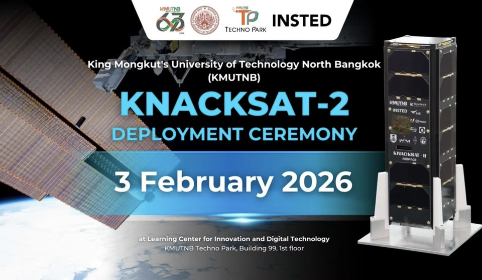 เมื่อวันที่ 3 กุมภาพันธ์ 2569 เวลา 13.30 น. ศาสตราจารย์ ดร.ธีรวุฒิ บุณยโสภณ นายกสภามหาวิทยาลัยเทคโนโลยีพระจอมเกล้าพระนครเหนือ (มจพ.) เป็นประธานกล่าวเปิดงานปล่อยดาวเทียมแนคแซท 2 (KNACKSAT-2) โดยมี ศาสตราจารย์ ดร.สุชาติ เซี่ยงฉิน ผู้อำนวยการอุทยานเทคโนโลยี กล่าวต้อนรับ พร้อมด้วย ศาสตราจารย์ ดร.ธานินทร์ ศิลป์จารุ อธิการบดี คณะผู้บริหาร ดร.พงศธร สายสุจริต รักษาการผู้อำนวยการสถาบันเทคโนโลยีอวกาศนานาชาติเพื่อการพัฒนาเศรษฐกิจ หัวหน้าโครงการ และนักวิจัยโครงการดาวเทียมแนคแซท 2 ร่วมเป็นสักขีพยาน ณ อุทยานเทคโนโลยี มจพ.