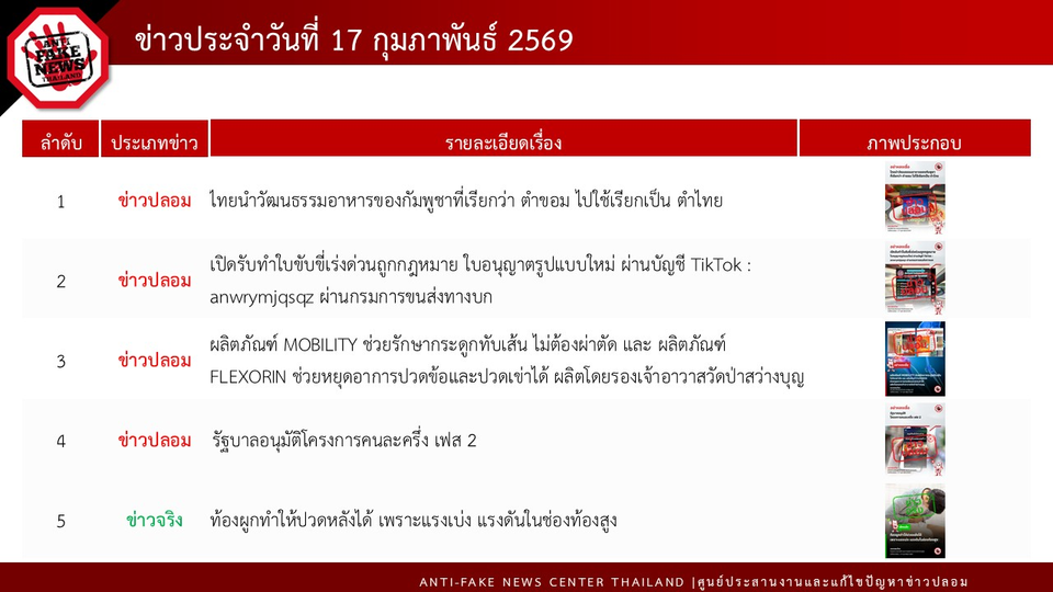 ทั้งนี้ในวันที่ 17 กุมภาพันธ์ 2569 AFNC ได้ตรวจสอบพบข้อความทั้งหมด 164,553 ข้อความ โดยมีข้อความที่ต้องดำเนินการตรวจสอบ (Verify) ทั้งสิ้น 16,694 ข้อความ สำหรับช่องทางที่มีการพบเบาะแสมากที่สุด คือ ข้อความที่มาจาก Social Listening 16,689 ข้อความ ตามมาด้วยช่องทาง Line Official 5 ข้อความ โดยเป็นเรื่องที่ต้องดำเนินการตรวจสอบทั้งหมด 39 เรื่อง ได้รับผลการตรวจสอบจากหน่วยงานที่เกี่ยวข้องแล้ว 9 เรื่องในจำนวนนี้เป็นข่าวที่ได้รับความสนใจจากประชาชนมากที่สุด 8 เรื่อง ซึ่งเป็นข่าวจริง 1 เรื่อง ข่าวปลอม 7 เรื่อง ได้แก่