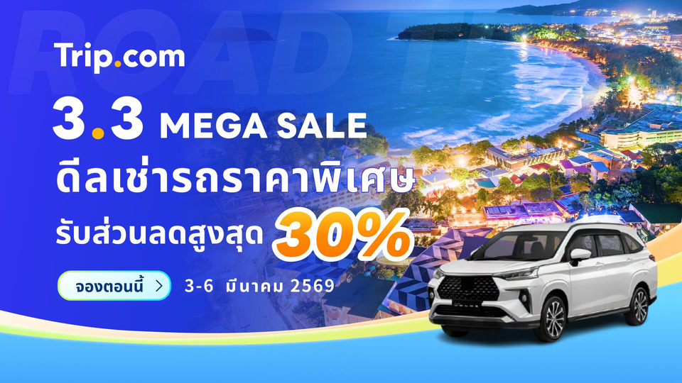 โปรโมชั่น 3.3 Mega Sale นำเสนอบริการเช่ารถที่ครอบคลุมของ Trip.com พร้อมคูปองเช่ารถส่วนลด 50% ที่ใช้ได้ในหลายจุดหมายปลายทาง รวมถึง เกาหลีใต้ ฮ่องกง ไทย ญี่ปุ่น ไต้หวัน สิงคโปร์ มาเลเซีย และออสเตรเลีย โดยเปิดให้ใช้โค้ดส่วนลดทุกวันตลอด 3-6 มีนาคม 2569
