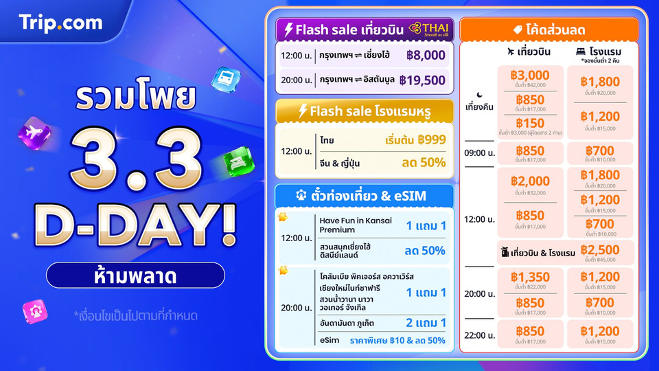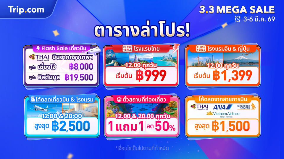 แคมเปญ 3.3 Mega Sale จาก Trip.com นำเสนอโปรโมชันพิเศษมากมาย ไม่ว่าจะเป็น Flash Sale ลด 50%* สำหรับการจองที่พัก เปิดจองวันละ 2 รอบ เวลา 12.00 น. และ 20.00 น. ตลอดวันที่ 3-6 มีนาคม 2569