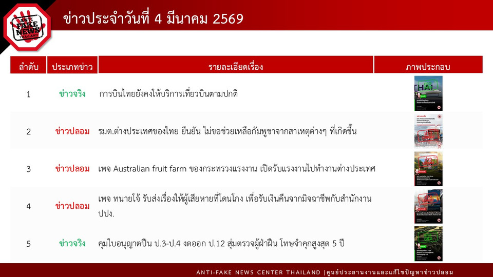 ทั้งนี้ ในวันที่ 4 มีนาคม 2569 AFNC ได้ตรวจสอบพบข้อความทั้งหมด 163,739 ข้อความ โดยมีข้อความที่ต้องดำเนินการตรวจสอบ (Verify) ทั้งสิ้น 2,734 ข้อความ สำหรับช่องทางที่มีการพบเบาะแสมากที่สุด คือ ข้อความที่มาจาก Social Listening 2,727 ข้อความ ตามมาด้วยช่องทาง Facebook 6 ข้อความ และช่องทาง Line Official 1 ข้อความ โดยเป็นเรื่องที่ต้องดำเนินการตรวจสอบทั้งหมด 25 เรื่อง ได้รับผลการตรวจสอบจากหน่วยงานที่เกี่ยวข้องแล้ว 8 เรื่อง