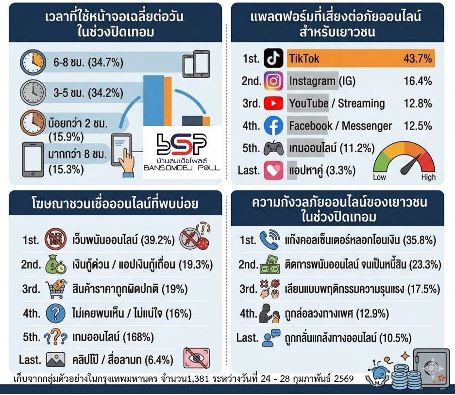ศูนย์สำรวจความคิดเห็นบ้านสมเด็จโพลล์ มหาวิทยาลัยราชภัฏบ้านสมเด็จเจ้าพระยา ได้ดำเนินโครงการสำรวจภัยออนไลน์ของเยาวชน ช่วงปิดเทอมใหญ่ 2569 โดยเก็บจากกลุ่มตัวอย่างจากประชาชนที่อาศัยอยู่ในจังหวัดกรุงเทพมหานคร จำนวนทั้งสิ้น 1,381 กลุ่มตัวอย่าง เก็บข้อมูลในวันที่ 24 - 28 กุมภาพันธ์ 2569