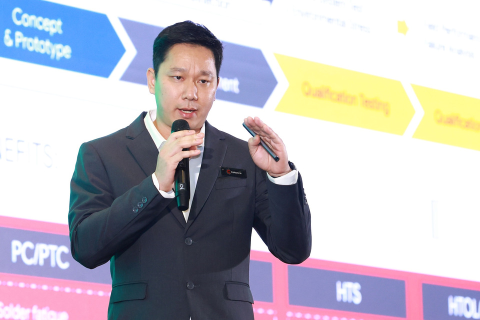 นางสาวเจตสุภา โปรานานนท์ Technical Director จาก CADFEM (Thailand) กล่าวว่า เทคโนโลยี Engineering Simulation กำลังกลายเป็นเครื่องมือสำคัญในการพัฒนาผลิตภัณฑ์อิเล็กทรอนิกส์ยุคใหม่ ในอดีต การพัฒนาผลิตภัณฑ์ต้องอาศัยการสร้างต้นแบบจริงหลายครั้งเพื่อทดสอบความทนทาน ซึ่งใช้ต้นทุนสูงและใช้เวลานาน แต่ Simulation สามารถจำลองพฤติกรรมของระบบอิเล็กทรอนิกส์ได้ตั้งแต่ขั้นตอนการออกแบบ ตัวอย่างเช่น การจำลองปรากฏการณ์ Multi-Physics ที่เกี่ยวข้องกับความร้อน การสั่นสะเทือน และโครงสร้างวัสดุ ซึ่งมีผลต่อความทนทานของ PCB เทคโนโลยีดังกล่าวช่วยให้วิศวกรสามารถค้นหาจุดอ่อนของการออกแบบตั้งแต่ต้นทาง และลดความเสี่ยงของความล้มเหลวในระหว่างการใช้งานจริง