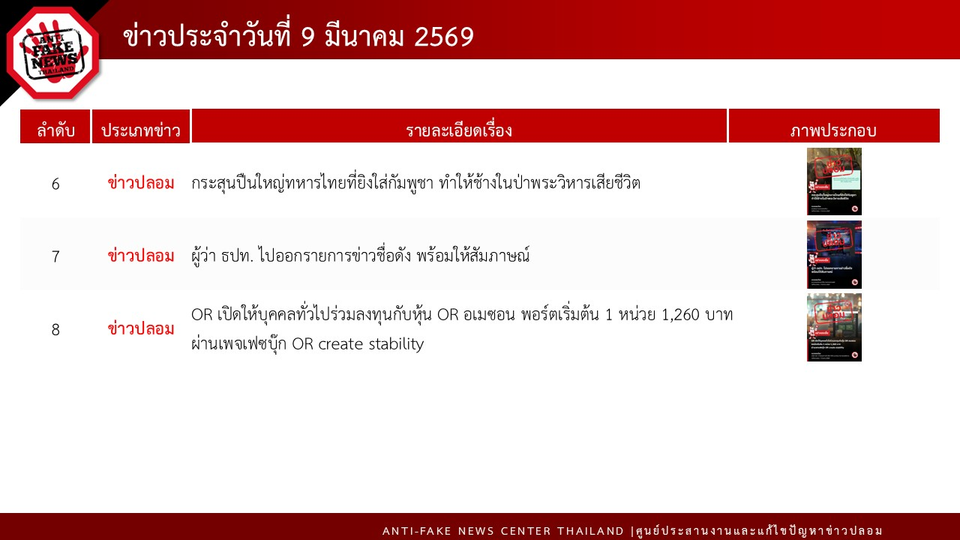 ทั้งนี้ ในวันที่ 9 มีนาคม 2569 AFNC ได้ตรวจสอบพบข้อความทั้งหมด 164,038 ข้อความ โดยมีข้อความที่ต้องดำเนินการตรวจสอบ (Verify) ทั้งสิ้น 1,621 ข้อความ สำหรับช่องทางที่มีการพบเบาะแสมากที่สุด คือ ข้อความที่มาจาก Social Listening 1,615 ข้อความ ตามมาด้วยช่องทาง Line Official 6 ข้อความ โดยเป็นเรื่องที่ต้องดำเนินการตรวจสอบทั้งหมด 14 เรื่อง ได้รับผลการตรวจสอบจากหน่วยงานที่เกี่ยวข้องแล้ว 9 เรื่องในจำนวนนี้เป็นข่าวที่ได้รับความสนใจจากประชาชนมากที่สุด 8 เรื่อง ซึ่งเป็นข่าวจริง 1 เรื่อง ข่าวปลอม 7 เรื่อง ได้แก่