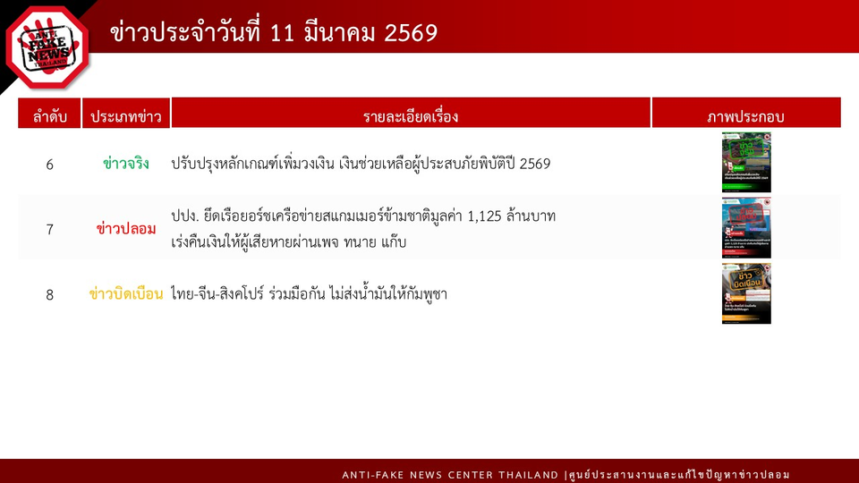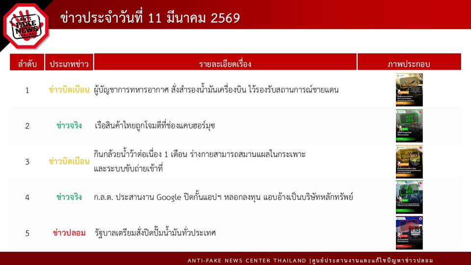 ทั้งนี้ ในวันที่ 11 มีนาคม 2569 AFNC ได้ตรวจสอบพบข้อความทั้งหมด 164,051 ข้อความ โดยมีข้อความที่ต้องดำเนินการตรวจสอบ (Verify) ทั้งสิ้น 1,795 ข้อความ สำหรับช่องทางที่มีการพบเบาะแสมากที่สุดคือ ข้อความที่มาจาก Social Listening 1,792 ข้อความ ตามมาด้วยช่องทาง Line Official 2 ข้อความ และช่องทาง Facebook 1 ข้อความ โดยเป็นเรื่องที่ต้องดำเนินการตรวจสอบทั้งหมด 30 เรื่อง ได้รับผลการตรวจสอบจากหน่วยงานที่เกี่ยวข้องแล้ว 10 เรื่อง ในจำนวนนี้เป็นข่าวที่ได้รับความสนใจจากประชาชนมากที่สุด 8 เรื่อง ซึ่งเป็นข่าวจริง 3 เรื่อง ข่าวปลอม 2 เรื่อง ข่าวบิดเบือน 3 เรื่อง ได้แก่