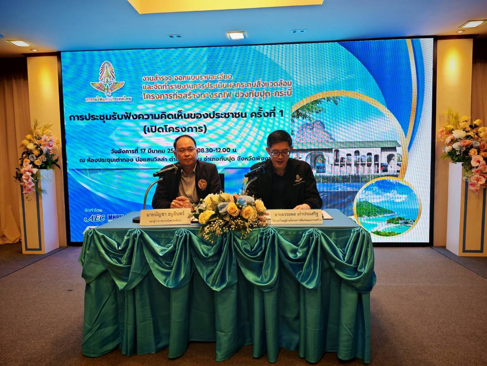 วันที่ 17 มีนาคม 2569 การรถไฟแห่งประเทศไทย (รฟท.) จัดประชุมรับฟังความคิดเห็นของประชาชน ครั้งที่ 1 งานสำรวจ ออกแบบรายละเอียดและจัดทำรายงานการประเมินผลกระทบสิ่งแวดล้อม โครงการก่อสร้างทางรถไฟ ช่วงทับปุด–กระบี่ โดยมีนายบัญชา ธนูอินทร์ รองผู้ว่าราชการจังหวัดพังงา และ นายอรรถพล เก่าประเสริฐ วิศวกรใหญ่ฝ่ายโครงการพิเศษและก่อสร้าง การรถไฟแห่งประเทศไทย ร่วมเป็นประธานเปิดการประชุม พร้อมด้วยผู้แทนจากหน่วยงานภาครัฐ ภาคเอกชน ภาคประชาชน ผู้นำชุมชน และประชาชนในพื้นที่เข้าร่วมรับฟังข้อมูลโครงการและแสดงความคิดเห็นอย่างกว้างขวาง ณ ห้องประชุมเต่าทอง บ่อแสนวิลล่า อำเภอทับปุด จังหวัดพังงา