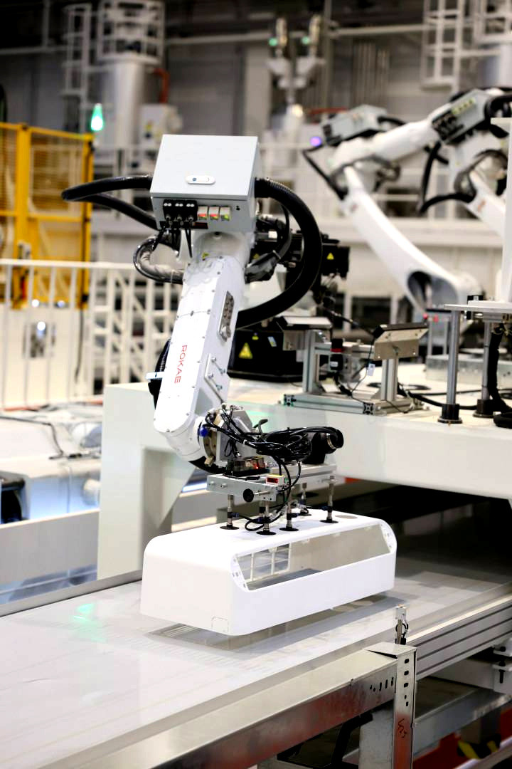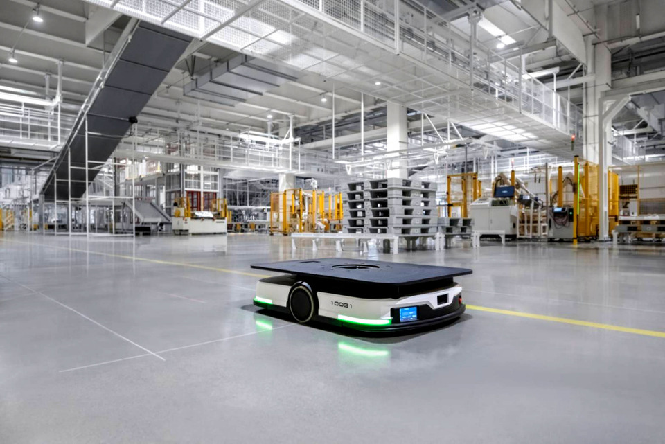 สิ่งที่โดดเด่นไม่แพ้กันคือเครือข่ายหุ่นยนต์จำนวนมหาศาลที่ทำงานร่วมกันอย่างเป็นระบบ หุ่นยนต์ในรูปแบบ Robot Dense Matrix ถูกใช้ในทุกขั้นตอนสำคัญ ขณะที่ AMR Robots ทำหน้าที่ขนส่งวัสดุอย่างอัตโนมัติ ลดความซับซ้อนของระบบโลจิสติกส์ภายในโรงงาน และเพิ่มความรวดเร็วในการเคลื่อนย้ายชิ้นส่วน