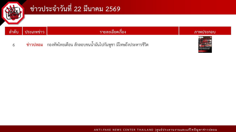 อันดับที่ 6 ข่าวปลอม เรื่อง กองทัพไทยเตือน ลักลอบขนน้ำมันไปกัมพูชา มีโทษถึงประหารชีวิต