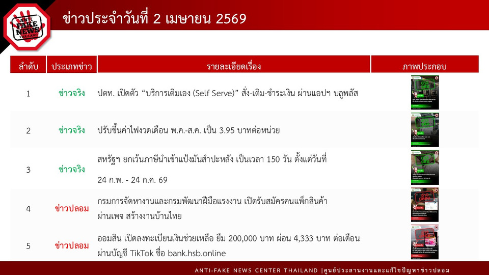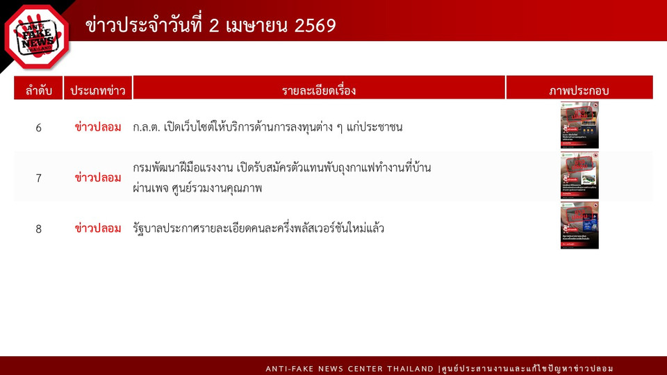ทั้งนี้ ในวันที่ 2 เมษายน 2569 AFNC ได้ตรวจสอบพบข้อความทั้งหมด 164,167 ข้อความ โดยมีข้อความที่ต้องดำเนินการตรวจสอบ (Verify) ทั้งสิ้น 3,200 ข้อความ สำหรับช่องทางที่มีการพบเบาะแสมากที่สุด คือ ข้อความที่มาจาก Social Listening 3,200 ข้อความ โดยเป็นเรื่องที่ต้องดำเนินการตรวจสอบทั้งหมด 26 เรื่อง ได้รับผลการตรวจสอบจากหน่วยงานที่เกี่ยวข้องแล้ว 12 เรื่อง ในจำนวนนี้เป็นข่าวที่ได้รับความสนใจจากประชาชนมากที่สุด 8 เรื่อง ซึ่งเป็นข่าวจริง 3 เรื่อง ข่าวปลอม 5 เรื่อง ได้แก่