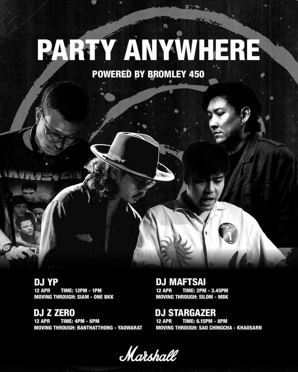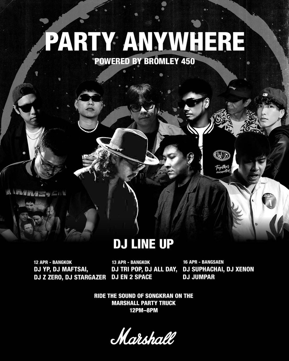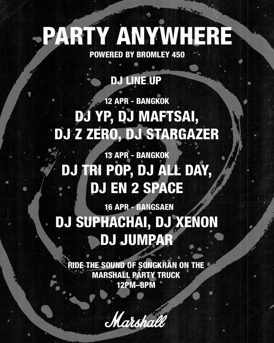 ไฮไลท์สำคัญของแคมเปญนี้คือการเปิดตัว Marshall Party Truck ดีไซน์เท่-ดุดันตามสไตล์ Marshall ที่จะเปลี่ยนท้องถนนให้กลายเป็นโซนวัฒนธรรมดนตรี โดยภายในและภายนอกรถได้รับการออกแบบเป็นพิเศษด้วยระบบเสียงคุณภาพที่จะทำให้ทุกถนนในกรุงเทพฯ กลายเป็นปาร์ตี้กับ Wall of Bromley ที่อัดแน่นด้วย Bromley 450 ถึง 37 ตัว ให้เสียงกระหึ่ม แบบ Non-Stop พร้อมกับทัพดีเจชั้นนำที่จะสร้างความสนุกแบบไร้ขีดจำกัด บนเส้นทางความมันส์ของ Marshall Party Truck (12-13,16 เมษายน 2569 ตั้งแต่เวลา 12:00 – 20:00 น.):