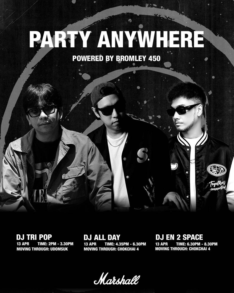 เตรียมตัวให้พร้อมมันส์ไปกับ Marshall Party Anywhere และ Bromley 450 ได้ในวันที่ 12 – 13 เมษายน ที่กรุงเทพฯ และ 16 เมษายน ที่บางแสน แล้วบันทึกโมเมนต์ “Party Anywhere” ของคุณด้วยการโชว์จิตวิญญาณแห่งความอิสระเพราะทุกที่คือปาร์ตี้