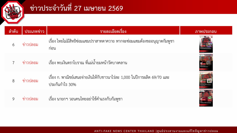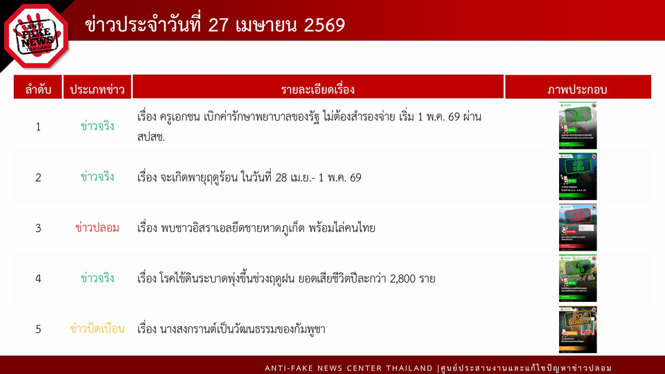 ทั้งนี้ ในวันที่ 27 เมษายน 2569 AFNC ได้ตรวจสอบพบข้อความทั้งหมด 160,910 ข้อความ โดยมีข้อความที่ต้องดำเนินการตรวจสอบ (Verify) ทั้งสิ้น 2,047 ข้อความ สำหรับช่องทางที่มีการพบเบาะแสมากที่สุด คือ ข้อความที่มาจาก Social Listening 2,039 ข้อความ ตามมาด้วยช่องทาง Line 7 ข้อความ และช่องทาง Facebook 1 ข้อความ โดยเป็นเรื่องที่ต้องดำเนินการตรวจสอบทั้งหมด 24 เรื่อง ได้รับผลการตรวจสอบจากหน่วยงานที่เกี่ยวข้องแล้ว 13 เรื่อง ในจำนวนนี้เป็นข่าวที่ได้รับความสนใจจากประชาชนมากที่สุด 9 เรื่อง ซึ่งเป็นข่าวจริง 3 เรื่อง ข่าวปลอม 5 เรื่อง ข่าวบิดเบือน 1 เรื่อง ได้แก่