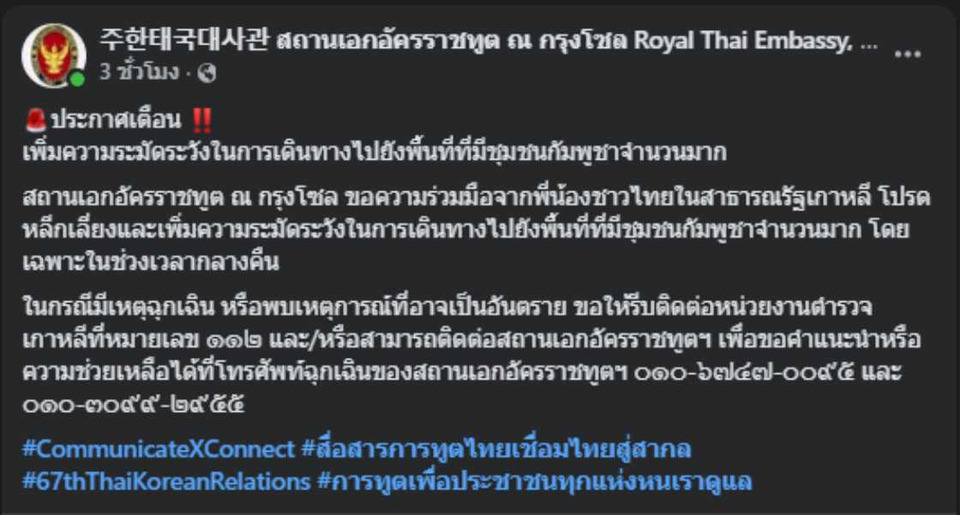 สถานเอกอัครราชทูต ณ กรุงโซล ขอความร่วมมือจากพี่น้องชาวไทยในสาธารณรัฐเกาหลี โปรดหลีกเลี่ยงและเพิ่มความระมัดระวังในการเดินทางไปยังพื้นที่ที่มีชุมชนกัมพูชาจำนวนมาก โดยเฉพาะในช่วงเวลากลางคืน