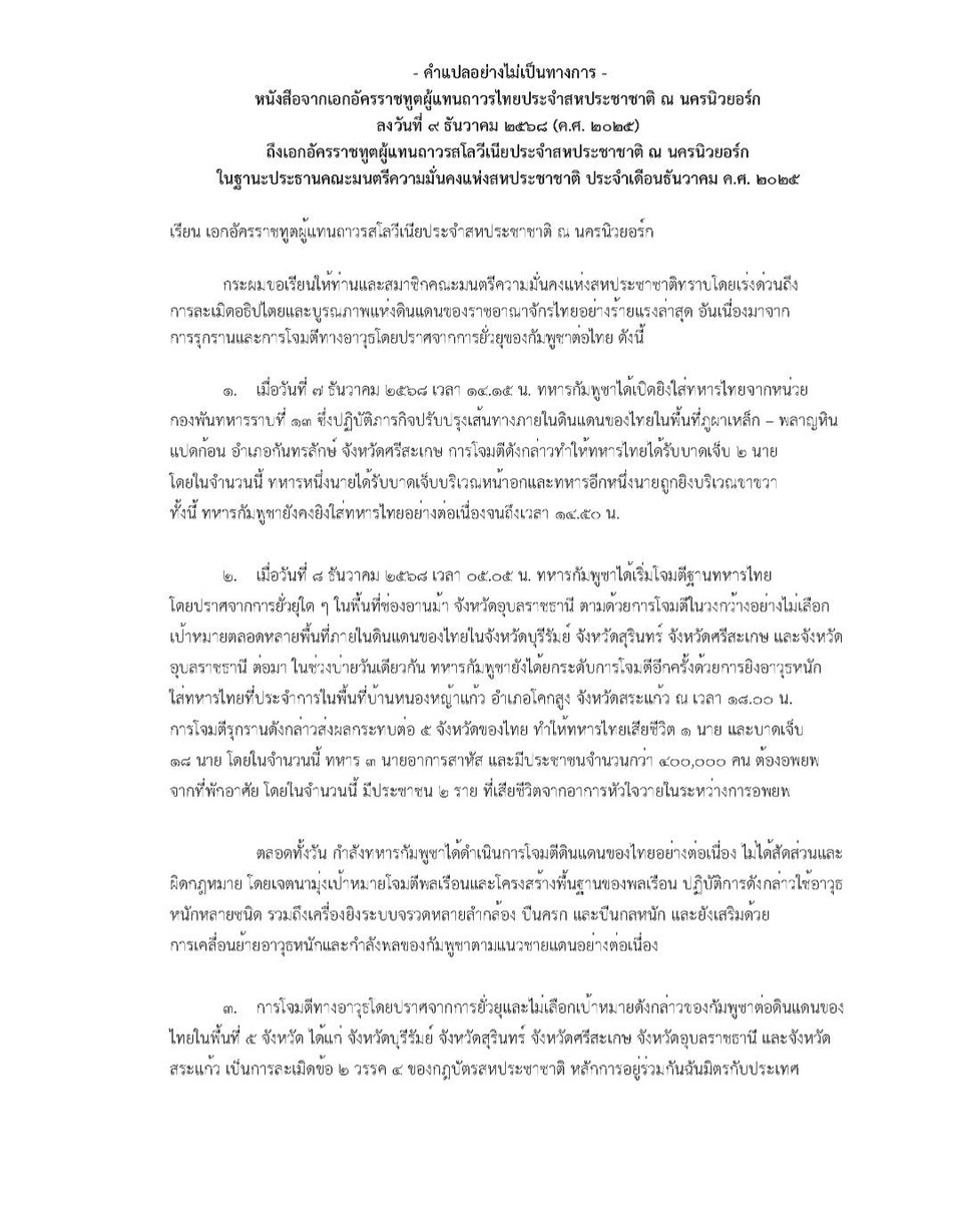 กระผมขอเรียนให้ท่านทราบโดยเร่งด่วนถึงการละเมิดอธิปไตยและบูรณภาพแห่งดินแดนของราชอาณาจักรไทยอย่างร้ายแรงล่าสุด อันเนื่องมาจากการรุกรานและการโจมตีทางอาวุธโดยปราศจากการยั่วยุของกัมพูชาต่อไทย ดังนี้