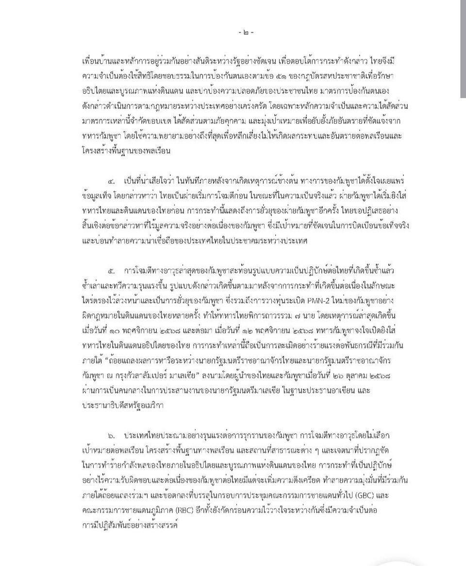 4. เป็นที่น่าเสียใจว่า ในทันทีภายหลังจากเกิดเหตุการณ์ข้างต้น ทางการของกัมพูชาได้ตั้งใจเผยแพร่ข้อมูลเท็จ โดยกล่าวหาว่าไทยเป็นฝ่ายเริ่มการโจมตีก่อน ในขณะที่ในความเป็นจริงแล้ว ฝ่ายกัมพูชาได้เริ่มยิงใส่ทหารไทยและดินแดนของไทยก่อน การกระทำนี้แสดงถึงการยั่วยุของฝ่ายกัมพูชาอีกครั้ง ไทยขอปฏิเสธอย่างสิ้นเชิงต่อข้อกล่าวหาที่ไร้มูลความจริงอย่างต่อเนื่องของกัมพูชา ซึ่งมีเป้าหมายที่ชัดเจนในการบิดเบือนข้อเท็จจริงและบ่อนทำลายความน่าเชื่อถือของประเทศไทยในประชาคมระหว่างประเทศ