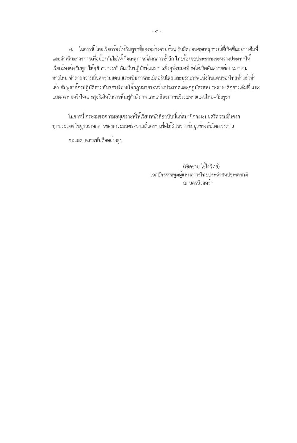 3. การโจมตีทางอาวุธโดยปราศจากการยั่วยุและไม่เลือกเป้าหมายดังกล่าวของกัมพูชาต่อดินแดนของไทยในพื้นที่ 5 จังหวัด ได้แก่ จังหวัดบุรีรัมย์ จังหวัดสุรินทร์ จังหวัดศรีสะเกษ จังหวัดอุบลราชธานี และจังหวัดสระแก้ว เป็นการละเมิดข้อ 2 วรรค 4 ของกฎบัตรสหประชาชาติหลักการอยู่ร่วมกันฉันมิตรกับประเทศเพื่อนบ้านและหลักการอยู่ร่วมกันอย่างสันติระหว่างรัฐอย่างชัดเจน