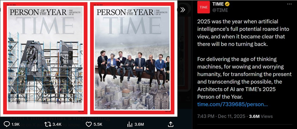เมื่อวันที่ 12 ธันวาคม 2568 นิตยสารไทม์ประกาศรางวัล บุคคลแห่งปี 2025 (Person of the Year 2025) โดยยกให้กลุ่ม “ผู้สร้างสรรค์ปัญญาประดิษฐ์” (Architects of AI) เป็นผู้ได้รับเลือก สะท้อนบทบาทสำคัญของเหล่านักพัฒนา นักวิจัย และผู้นำเทคโนโลยี AI ที่กำลังมีอิทธิพลต่ออนาคตของโลกในทุกมิติ