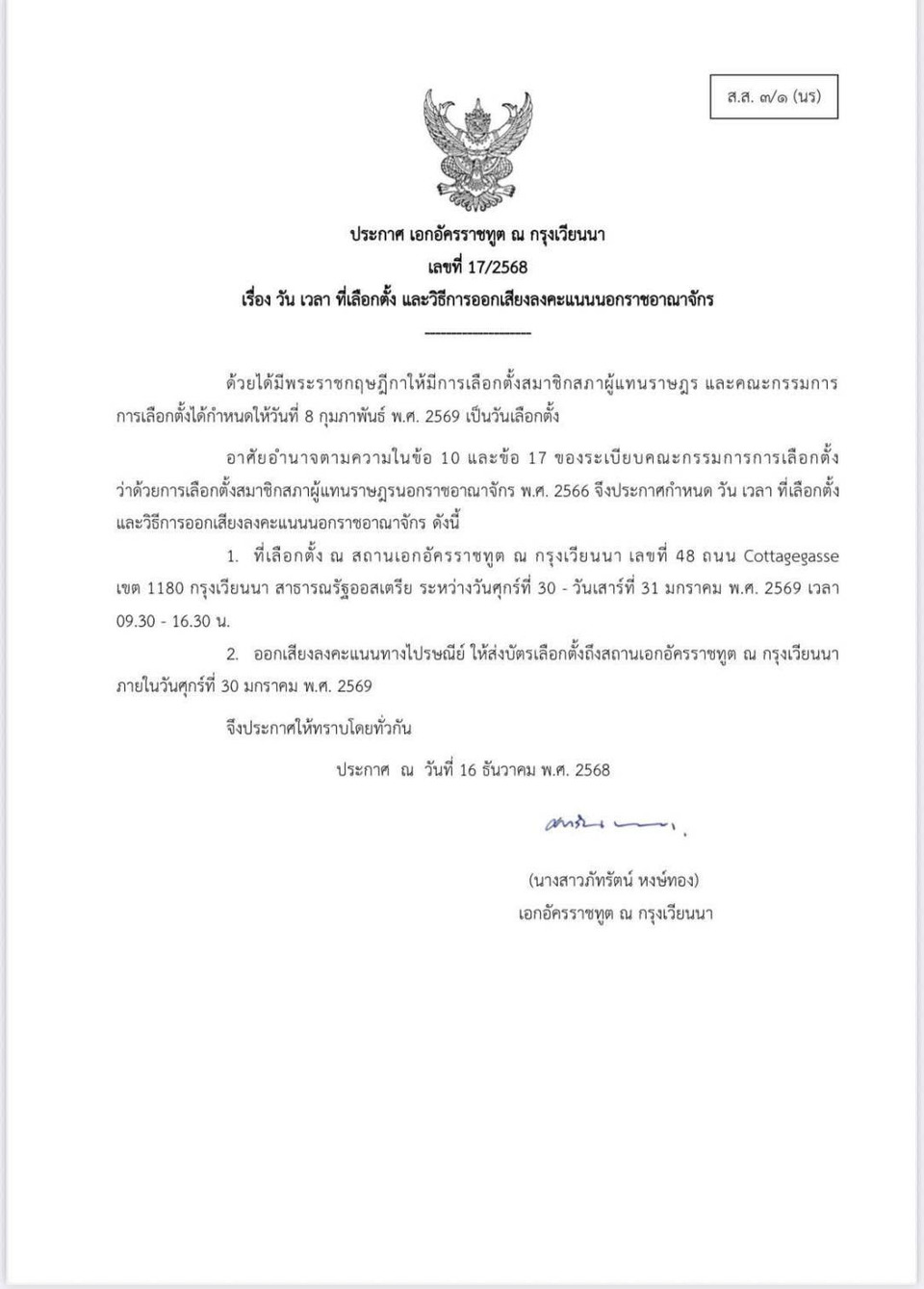 วันนี้ ( 17 ธ.ค.) ผู้สื่อข่าวรายงานว่า สถานเอกอัคราชทูตไทยในต่างประเทศได้เริ่มออกประกาศเอกอัครราชทูต กำหนดวันเวลาและวิธีการลงคะแนนเสียงนอกราชอาณาจักร หลังมีพระราชกฤษฎีกาให้มีการเลือกตั้งสมาชิกสภาผู้แทนราษฎรและคณะกรรมการการเลือกตั้งได้กำหนดให้ จัดการเลือกตั้งในวันที่ 8 กุมภาพันธ์ 2569 เพื่อแจ้งคนไทยที่อาศัยอยู่ในต่างประเทศได้รับทราบถึงวิธีการและสถานที่ในการเลือกตั้งนอกราชอาณาจักร