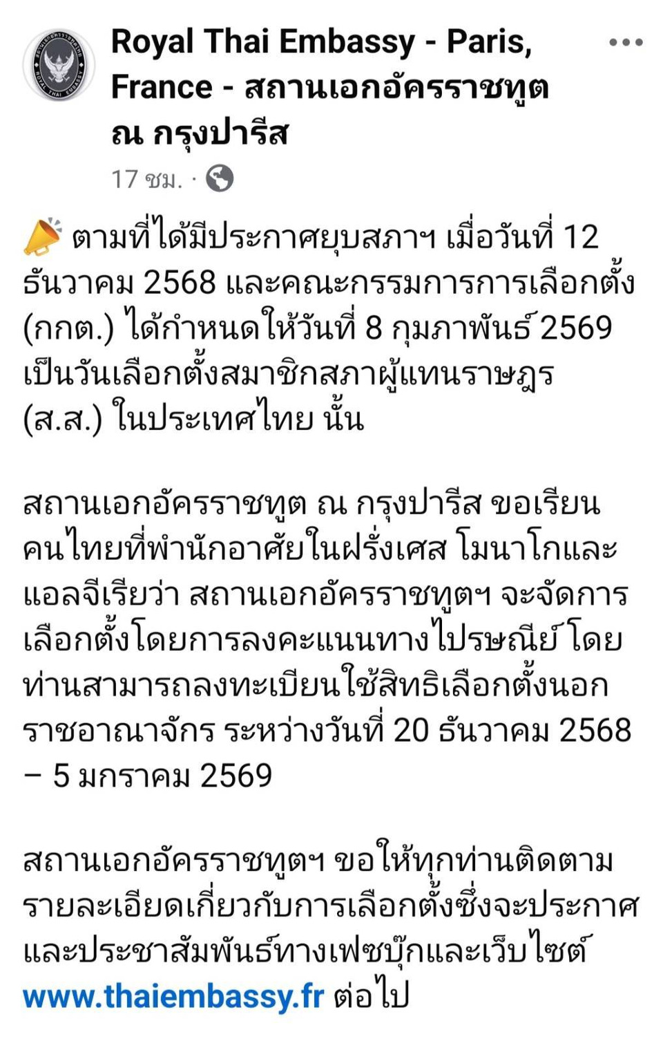 สถานเอกอัครราชทูตไทย ณ กรุงปารีส ออกประกาศ ว่า ตามที่ได้มีประกาศยุบสภาฯ เมื่อวันที่ 12 ธ.ค. และคณะกรรมการการเลือกตั้ง (กกต.) ได้กำหนดให้วันที่ 8 ก.พ. 2569 เป็นวันเลือกตั้งสมาชิกสภาผู้แทนราษฎร (ส.ส.) ในประเทศไทย นั้น ขอเรียนคนไทยที่พำนักอาศัยในฝรั่งเศส โมนาโกและแอลจีเรียว่า สถานเอกอัครราชทูตฯ จะจัดการเลือกตั้งโดยการลงคะแนนทางไปรษณีย์ โดยท่านสามารถลงทะเบียนใช้สิทธิเลือกตั้งนอกราชอาณาจักร ระหว่างวันที่ 20 ธ.ค. 2568 – 5 ม.ค. 2569