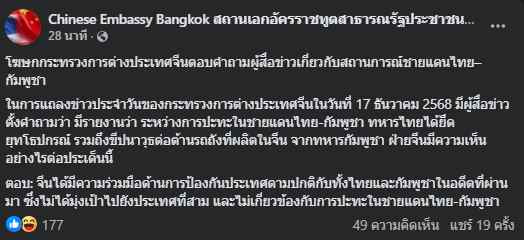 วันที่ 17 ธ.ค.68 เพจเฟซบุ๊ก Chinese Embassy Bangkok สถานเอกอัครราชทูตสาธารณรัฐประชาชนจีนประจำประเทศไทย โพสต์ข้อความระบุว่า...