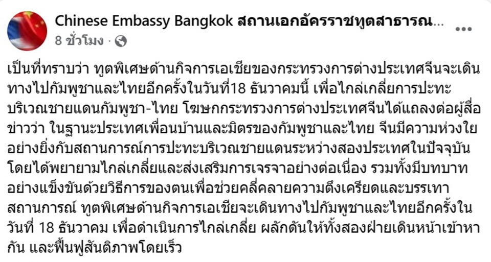 วันที่ 18 ธ.ค.68 เฟซบุ๊กเพจ Chinese Embassy Bangkok สถานเอกอัครราชทูตสาธารณรัฐประชาชนจีนประจำประเทศไทย โพสต์ข้อความระบุว่า เป็นที่ทราบว่า ทูตพิเศษด้านกิจการเอเชียของกระทรวงการต่างประเทศจีนจะเดินทางไปกัมพูชาและไทยอีกครั้งในวันที่18 ธันวาคมนี้ เพื่อไกล่เกลี่ยการปะทะบริเวณชายแดนกัมพูชา-ไทย โฆษกกระทรวงการต่างประเทศจีนได้แถลงต่อผู้สื่อข่าวว่า ในฐานะประเทศเพื่อนบ้านและมิตรของกัมพูชาและไทย จีนมีความห่วงใยอย่างยิ่งกับสถานการณ์การปะทะบริเวณชายแดนระหว่างสองประเทศในปัจจุบัน โดยได้พยายามไกล่เกลี่ยและส่งเสริมการเจรจาอย่างต่อเนื่อง รวมทั้งมีบทบาทอย่างแข็งขันด้วยวิธีการของตนเพื่อช่วยคลี่คลายความตึงเครียดและบรรเทาสถานการณ์ ทูตพิเศษด้านกิจการเอเชียจะเดินทางไปกัมพูชาและไทยอีกครั้งในวันที่ 18 ธันวาคม เพื่อดำเนินการไกล่เกลี่ย ผลักดันให้ทั้งสองฝ่ายเดินหน้าเข้าหากัน และฟื้นฟูสันติภาพโดยเร็ว