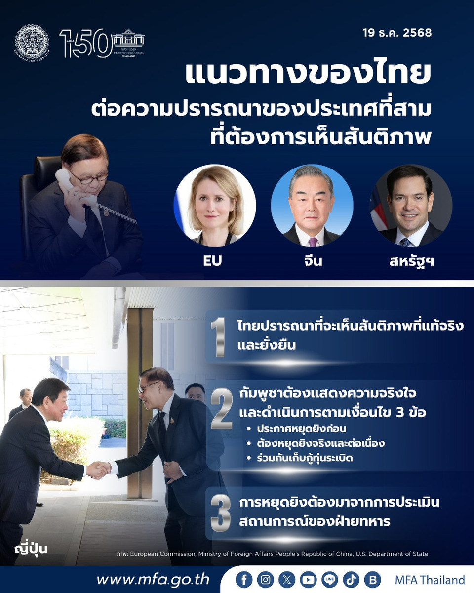 วันที่ 20 ธ.ค.68 เพจ กระทรวงการต่างประเทศ Ministry of Foreign Affairs of the Kingdom of Thailand โพสต์ข้อความระบุว่า แนวทางของไทยต่อความปรารถนาของประเทศที่สามที่ต้องการเห็นสันติภาพ