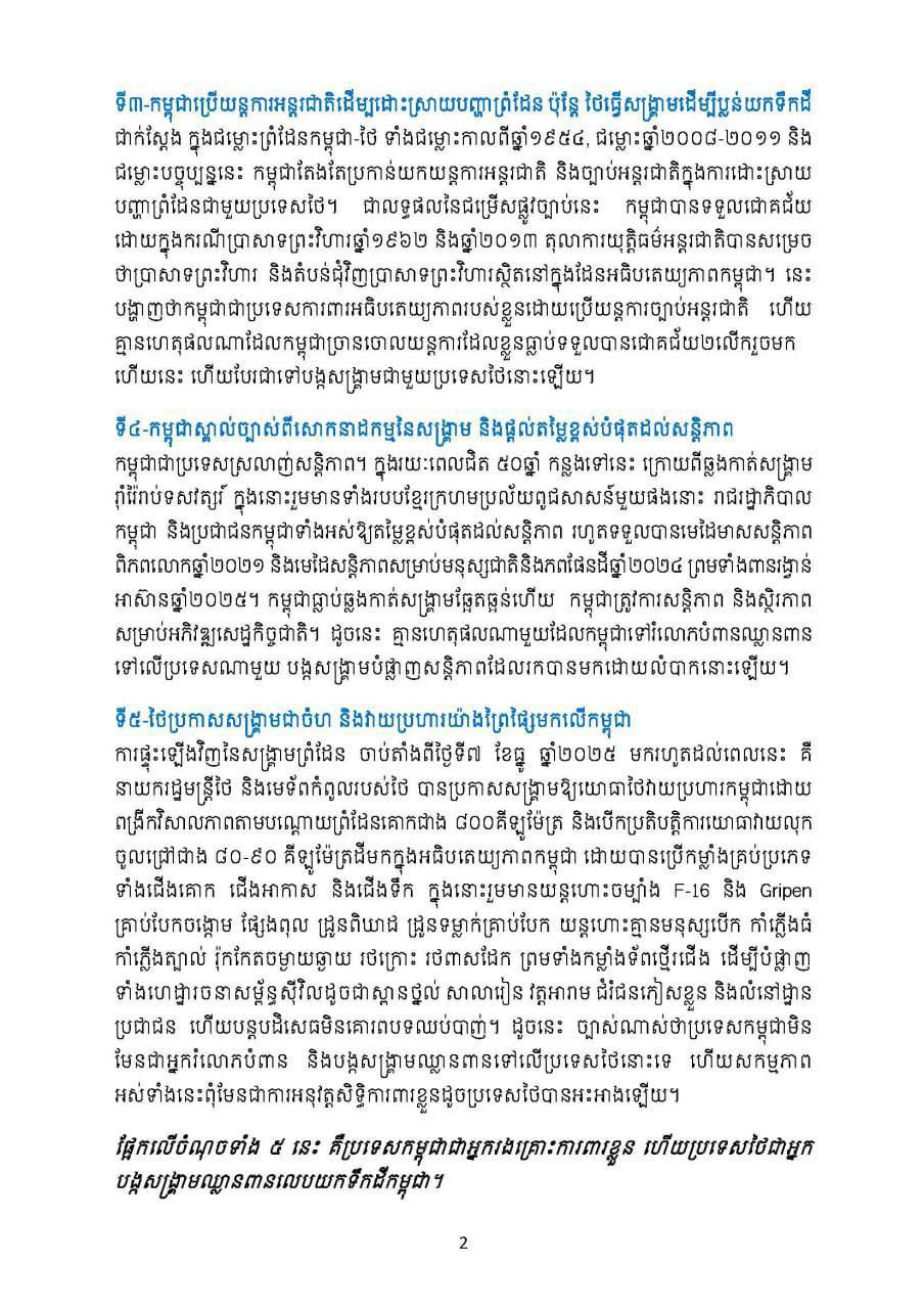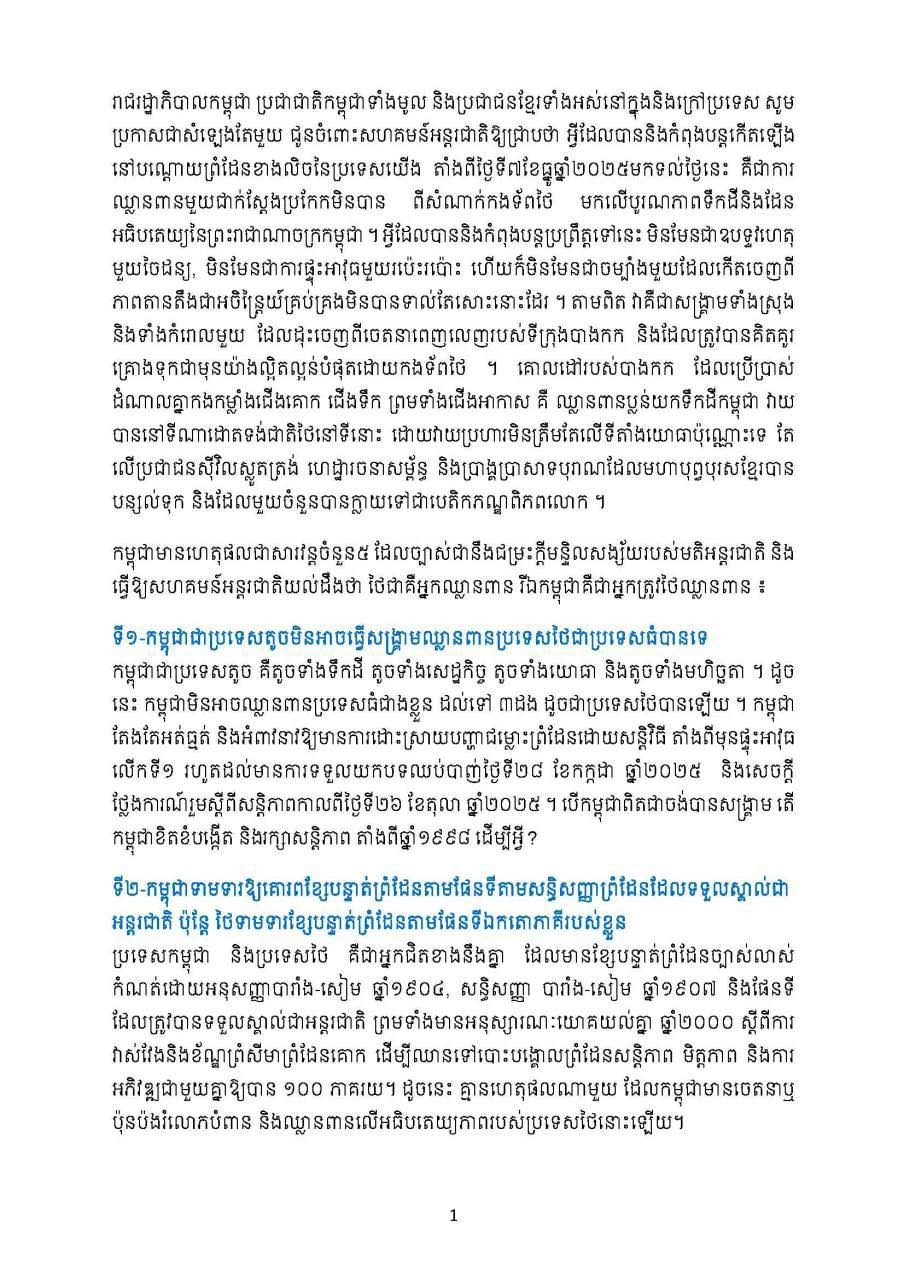 เมื่อวันที่ 22 ธ.ค.68 เพจเฟซบุ๊กของกระทรวงสารสนเทศกัมพูชา ได้เผยแพร่เอกสารจดหมายเปิดผนึกจากราชอาณาจักรกัมพูชาถึงประชาคมระหว่างประเทศ เรียกร้องนานาชาติอย่าเงียบกรณีความขัดแย้งไทย-กัมพูชา โดยเอกสารมีเนื้อหา ระบุว่า "รัฐบาลกัมพูชา ประชาชนชาวกัมพูชาทั้งประเทศ และประชาชนชาวกัมพูชาทั้งในและต่างประเทศ ขอประกาศเป็นเสียงเดียวกันต่อประชาคมระหว่างประเทศว่า สิ่งที่เกิดขึ้นตามแนวชายแดนด้านตะวันตกของประเทศของเรา ตั้งแต่วันที่ 7 ธ.ค.2568 จนถึงปัจจุบัน เป็นการรุกรานอย่างไม่อาจปฏิเสธได้โดยกองทัพไทยต่อบูรณภาพดินแดนและอธิปไตยของราชอาณาจักรกัมพูชา สิ่งที่เกิดขึ้นไม่ใช่เหตุการณ์สุ่ม ไม่ใช่การระเบิดของอาวุธโดยบังเอิญ และไม่ใช่สงครามที่เกิดขึ้นจากความตึงเครียดที่ยืดเยื้อและควบคุมไม่ได้ แต่มันคือสงครามที่รัฐบาลไทยวางแผน รับรู้ และดำเนินการ