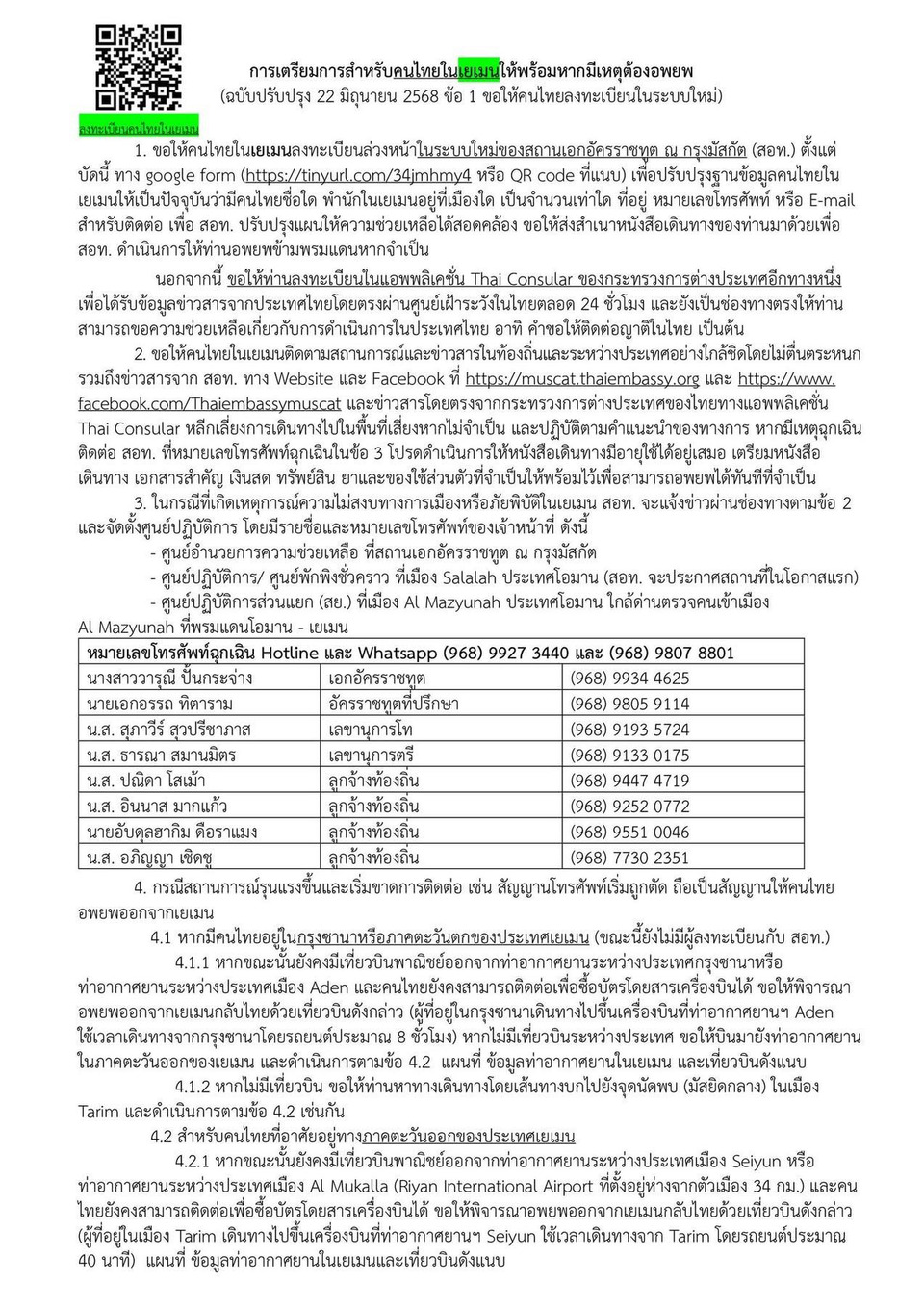 2. ทบทวนเอกสาร “การเตรียมการสำหรับคนไทยในโอมานให้พร้อมหากมีเหตุต้องอพยพ” และ “การเตรียมการสำหรับคนไทยในเยเมนให้พร้อมหากมีเหตุต้องอพยพ” ฉบับปรับปรุงวันที่ 22 มิ.ย. 2568 ที่แนบมานี้ เพื่อพร้อมปฏิบัติหากสถานการณ์ลุกลามและจำเป็น